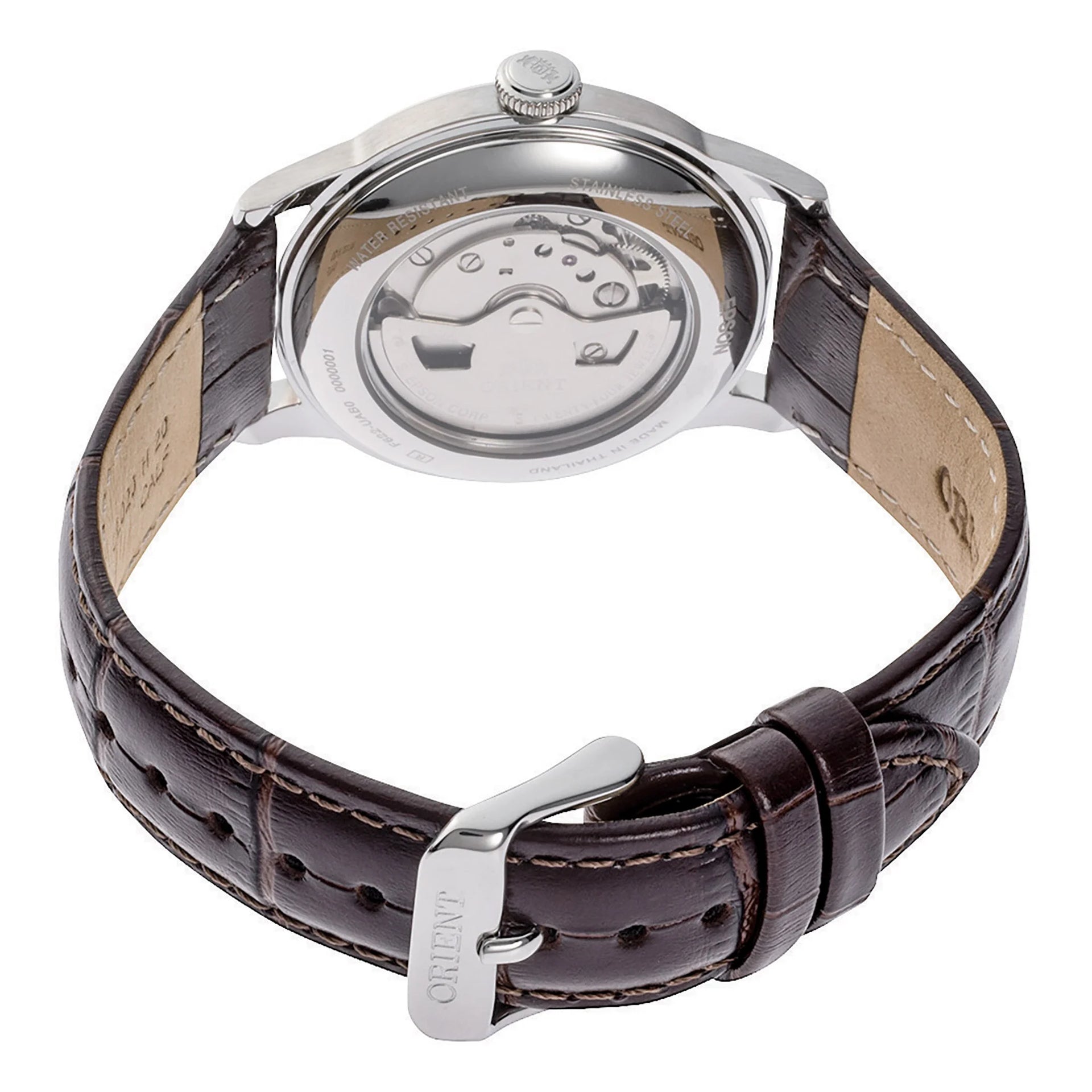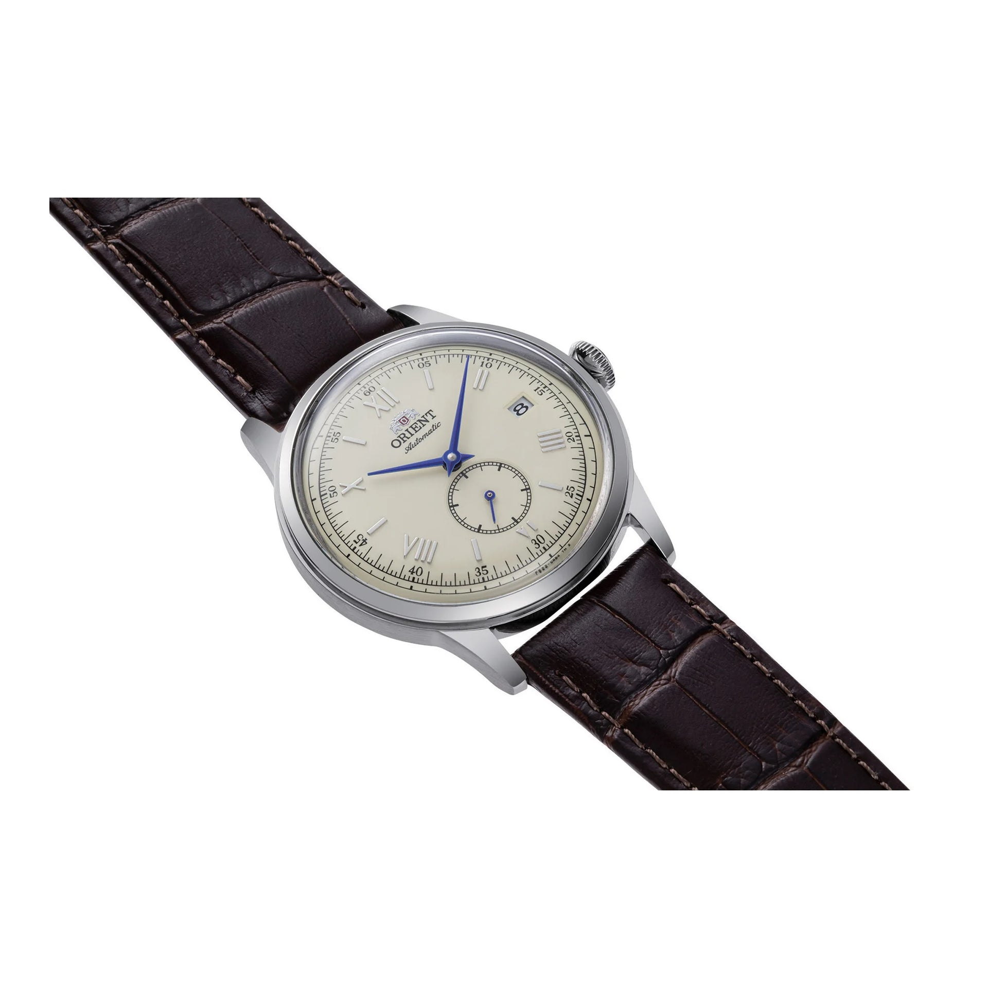 In the realm of timeless elegance, the ORIENT AP01 Bambino 38 Small Seconds emerges as a beacon of classic sophistication. Crafted with meticulous attention to detail, this watch embodies the essence of refined design. Its round case, bathed in a subtle silver grey hue, perfectly complements the chocolate brown leather band, creating a harmonious blend of colors that speaks to the discerning gentleman. The 38mm case diameter offers a balanced presence on the wrist, while the mineral crystal ensures clarity and durability. Beneath the surface, the mechanical movement, powered by the F6222 caliber with 24 jewels, promises precision and reliability, enhanced by both hand-wound and automatic capabilities. The beige dial, adorned with a date calendar and three hands, exudes a vintage charm that is both understated and captivating. The transparent back offers a glimpse into the intricate workings of this masterpiece, a testament to its craftsmanship. Water-resistant and equipped with a pull & push crown, this watch is designed for those who appreciate the finer things in life. The tang buckle closure ensures a secure fit, making it a perfect companion for any occasion. With a daily accuracy of +25/-15, the ORIENT AP01 Bambino 38 Small Seconds is not just a timepiece, it is a statement of style and sophistication, a tribute to the enduring allure of classic watchmaking.