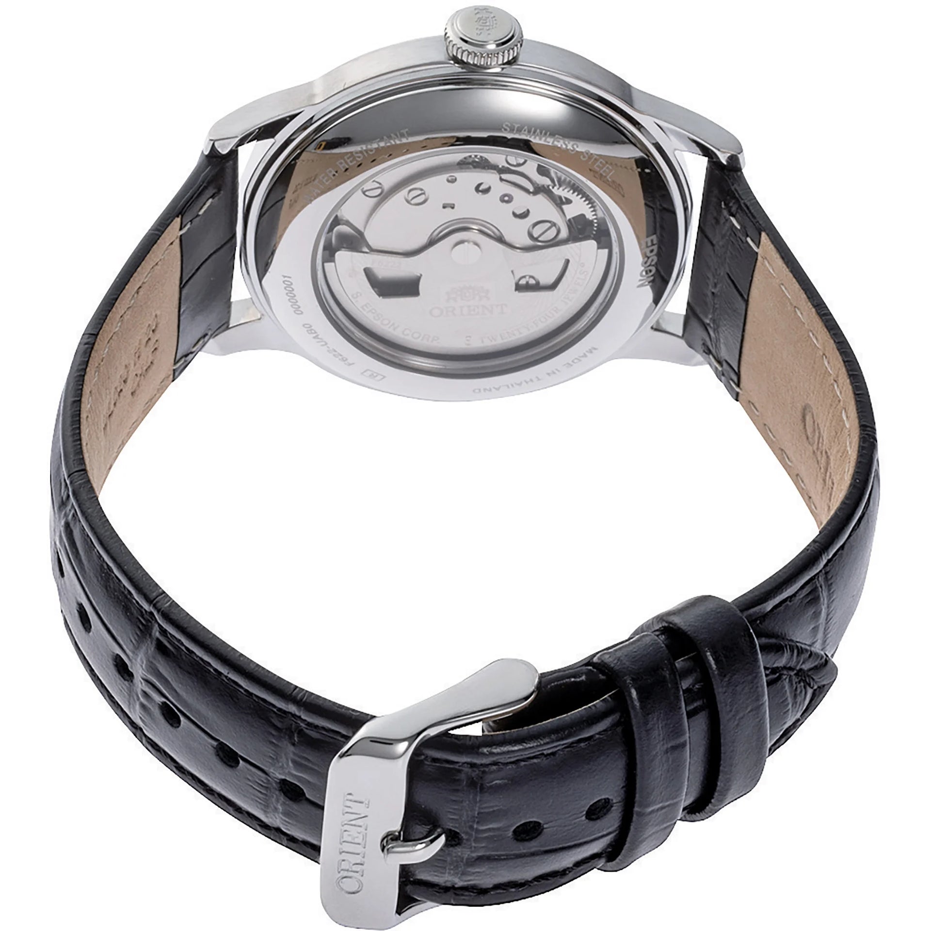 In the realm of timeless elegance, the ORIENT AP01 Bambino 38 Small Seconds watch stands as a testament to classic sophistication. Crafted with meticulous attention to detail, this masterpiece from the ORIENT Classic family embodies the essence of refined design. Its round case, bathed in a subtle silver grey hue, measures a perfect 38mm, offering a harmonious balance between presence and subtlety. The mineral crystal protects a striking black dial, where the dance of three hands is orchestrated by the precise F6222 caliber, boasting 24 jewels. This mechanical marvel, both hand-wound and automatic, ensures a daily accuracy of +25/-15, a testament to its engineering excellence. The transparent back reveals the intricate workings, a hidden world of artistry and precision. Encased in a water-resistant shell, this watch is as practical as it is beautiful. The black leather band, secured with a tang buckle, wraps comfortably around the wrist, exuding a sense of understated luxury. The pull & push crown and the date calendar add to its functionality, making it a perfect companion for the discerning gentleman. With its classic style and impeccable craftsmanship, the ORIENT AP01 Bambino 38 Small Seconds watch is not just a timepiece, it is a statement of enduring elegance and timeless charm.