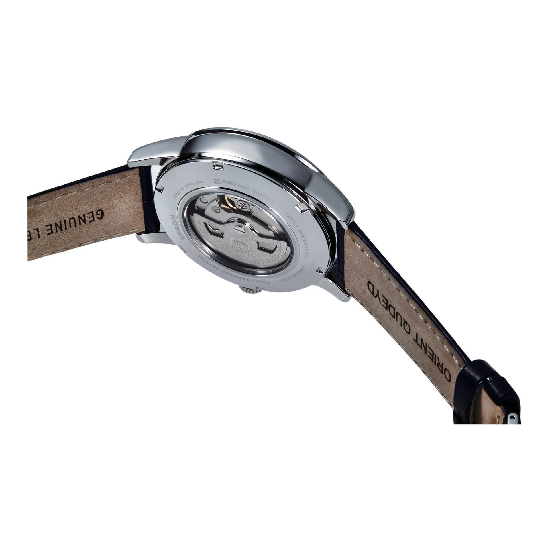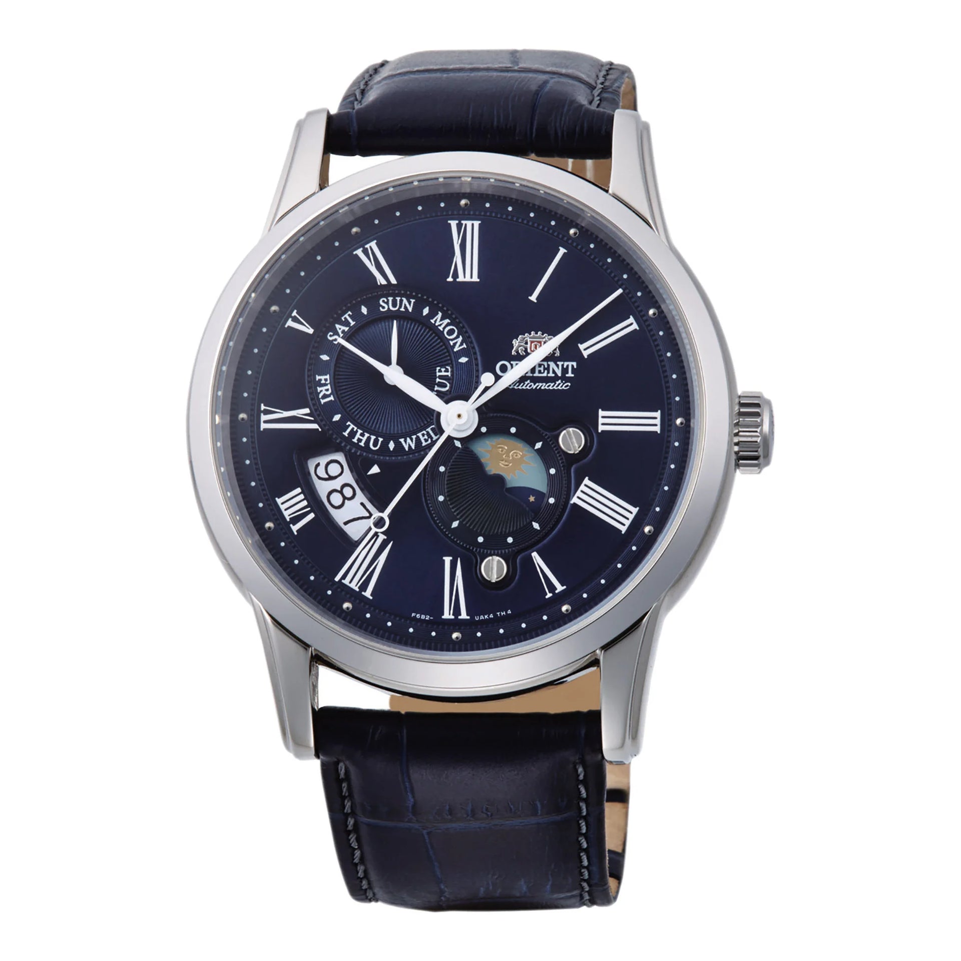 In the realm of horology, where time is both a master and a muse, emerges a masterpiece that captures the essence of classic elegance and mechanical precision. Crafted in the heart of innovation, the ORIENT Classic AK00 Sun & Moon watch is a testament to timeless sophistication. Its round case, bathed in a silver-grey hue, exudes a subtle yet commanding presence, perfectly complementing the deep blue leather band that wraps around the wrist with a sense of refined luxury. The sapphire crystal face reveals a captivating blue dial, where the dance of the sun and moon unfolds, offering a poetic glimpse into the passage of time. This watch is not merely an accessory, it is a statement of style and substance, designed for the discerning gentleman who appreciates the art of watchmaking. With a case diameter of 42mm, it strikes a harmonious balance between boldness and elegance, while the transparent back offers a window into the intricate mechanical movement powered by the F6B24 caliber. The 22 jewels within ensure a smooth and precise operation, with a daily accuracy of +25/-15, making it a reliable companion for any occasion. Water-resistant up to 50 meters, it is as versatile as it is beautiful, ready to accompany you from boardroom meetings to evening soirees. The folding deployant clasp with a push-button closure ensures a secure fit, while the pull & push crown allows for effortless adjustments. With both hand-wound and automatic capabilities, this watch is a celebration of craftsmanship and innovation, a true embodiment of the ORIENT legacy.