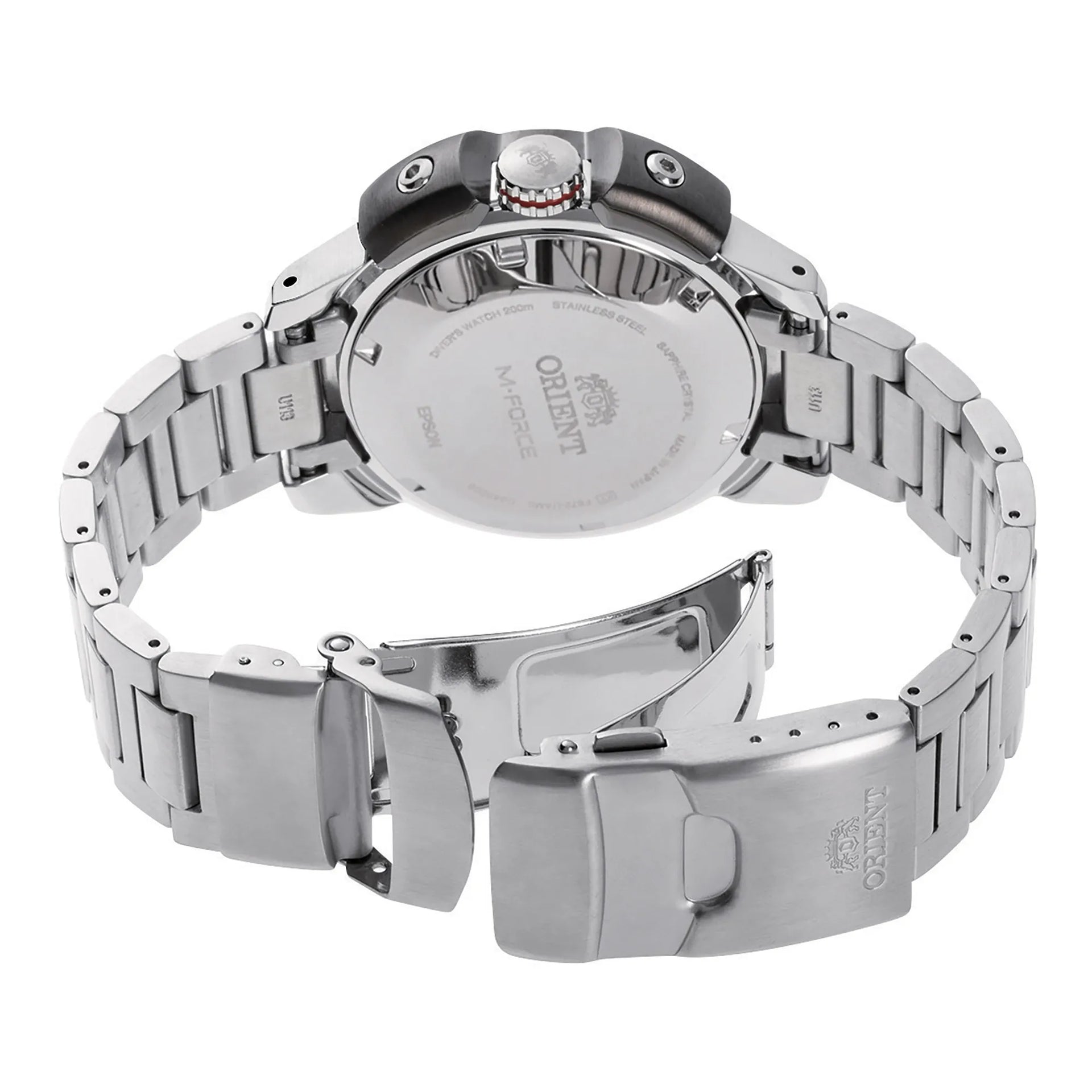In the realm of timepieces, where precision meets passion, emerges a creation that embodies the spirit of adventure and the allure of the unknown. Crafted in Japan, the ORIENT AC0L M-Force is a testament to the brand's dedication to excellence and innovation. This watch, a proud member of the ORIENT Sports family, is designed for the modern man who thrives on challenges and seeks the thrill of the great outdoors. Its round case, cloaked in a sleek black hue, commands attention with a commanding diameter of 47mm, making a bold statement on any wrist. The vibrant orange dial, a nod to pop culture's daring flair, adds a splash of color that captivates and intrigues. Beneath its sapphire crystal, the heart of this timepiece beats with the precision of a mechanical movement, powered by the F6727 caliber with 22 jewels, ensuring accuracy with a daily variance of +25/-15 seconds. The stainless steel band, in a sophisticated silver-grey, complements the watch's dynamic aesthetic, secured with a folding deployant clasp featuring a push-button and safety lock for added security. With a water resistance of up to 200 meters, this diver's watch is ready to accompany you on underwater explorations, while the screw-down crown ensures its durability. The date calendar and 3-hand display offer practicality without compromising style. Whether hand-wound or automatic, the ORIENT AC0L M-Force is a masterpiece of refined design, a symbol of resilience and elegance that transcends time.