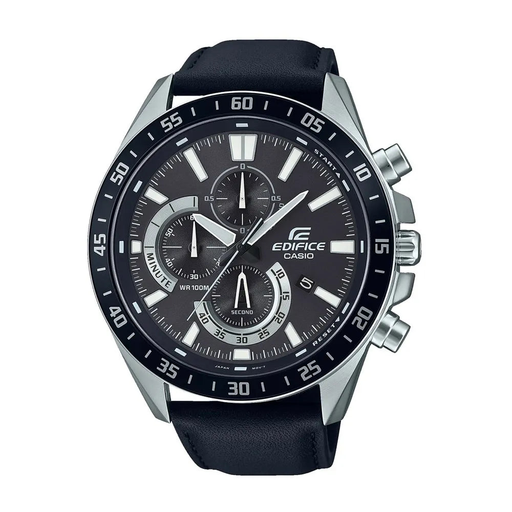 In the world of timepieces, where precision meets style, emerges a creation that embodies the essence of modern masculinity. Crafted in the heart of innovation, the CASIO Edifice watch is a testament to the art of horology, designed for the man who values both form and function. Its round case, bathed in a sleek silver grey hue, commands attention with a commanding diameter of 50mm, making a bold statement on any wrist. The mineral crystal shields the intricate chronograph display, a symphony of precision and elegance, while the pull & push crown offers seamless control. Water-resistant up to 100 meters, this watch is ready to accompany you on any adventure, whether on land or sea. The black leather band, secured with a tang buckle, adds a touch of classic sophistication, perfectly complementing the black dial that houses a date calendar for added practicality. Powered by a reliable quartz movement, this timepiece ensures accuracy and dependability. The CASIO Edifice watch is not just an accessory, it's a reflection of a lifestyle that embraces the casual yet refined, where every moment is an opportunity to make a statement.