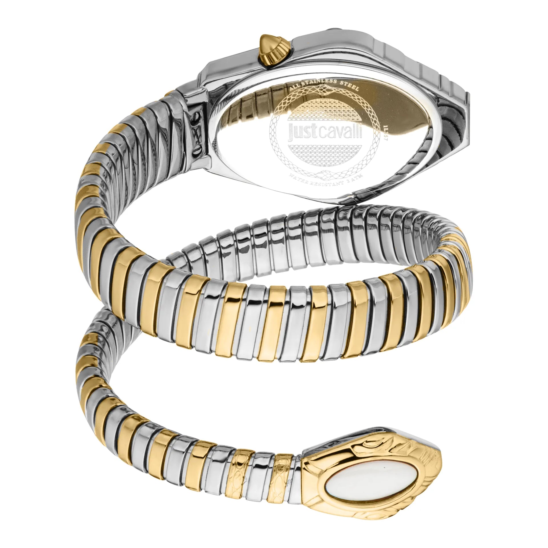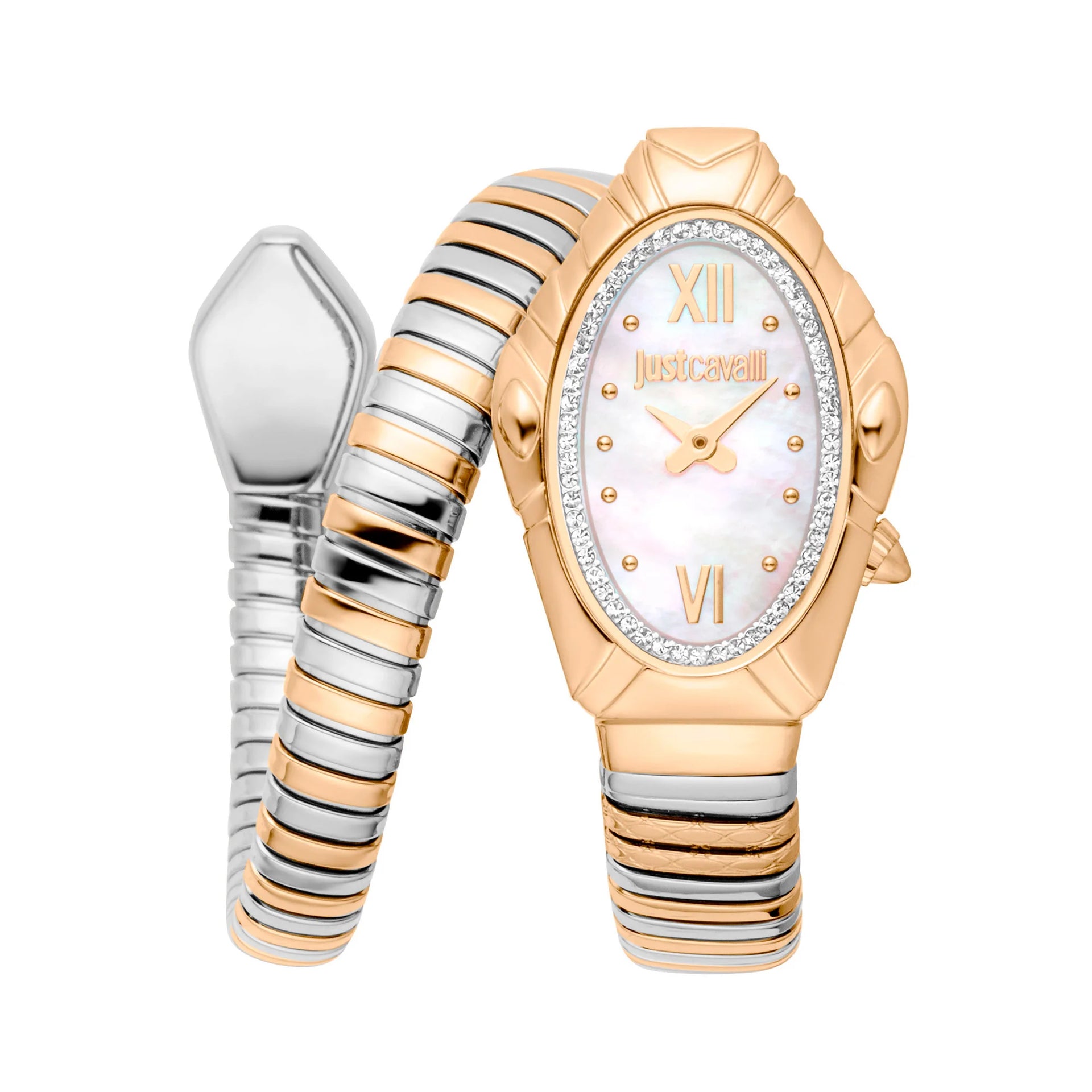 In the realm of timeless elegance, where fashion meets audacity, emerges a masterpiece that defies convention. This Just Cavalli Watch, a part of the illustrious Just Cavalli Signature Snake collection, is a testament to bold femininity and refined design. Crafted in the heart of Swiss watchmaking, it embodies the spirit of daring sophistication. The oval case, bathed in a luxurious yellow gold hue, captures the essence of opulence, while its compact 25mm diameter ensures a delicate yet striking presence on the wrist. The antique white dial, reminiscent of classic artistry, is a canvas where time is painted with precision by two elegant hands, powered by a reliable quartz movement. Encased in mineral crystal, it offers a glimpse into a world where tradition meets modernity. The pull & push crown adds a touch of practicality to its exquisite design. The stainless steel band, also in yellow gold, wraps around the wrist like a golden serpent, a nod to the collection's signature motif. Water-resistant, this watch is not just an accessory but a companion for life's adventures, ready to withstand the elements with grace. With every glance, it whispers tales of audacity and character, inviting the wearer to embrace their inner strength and style. This Just Cavalli Watch is more than a timepiece, it's a statement of individuality and a celebration of the fearless spirit that defines modern fashion.