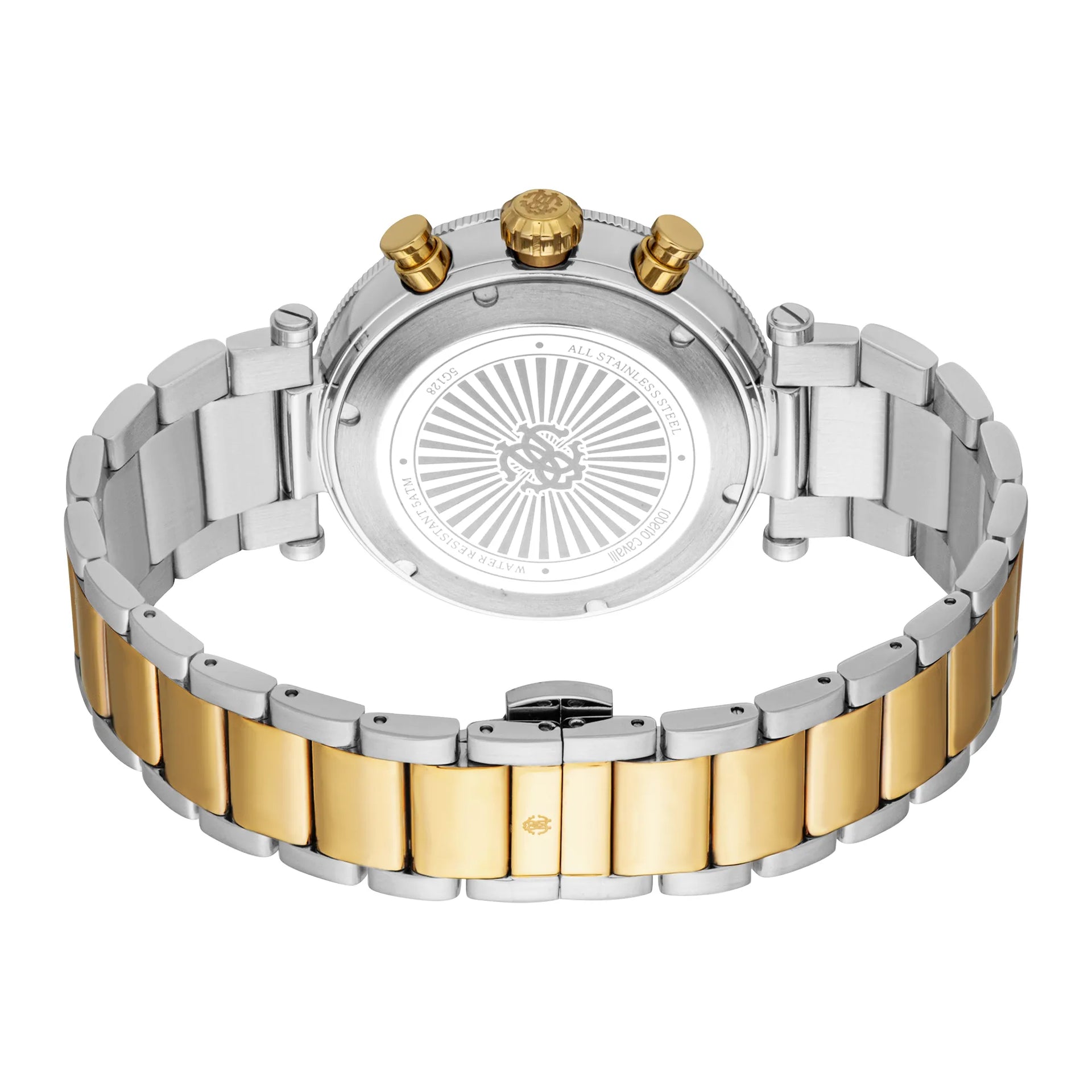 In the realm of timepieces, where elegance meets precision, emerges a creation that embodies the essence of modern masculinity. Crafted in the heart of Swiss expertise, this Roberto Cavalli Gent watch is a testament to refined design and sophisticated style. Its round case, bathed in a sleek silver grey hue, commands attention with a commanding diameter of 43mm, making it a bold statement on any wrist. The allure of this watch is further enhanced by its yellow gold stainless steel band, a striking contrast that exudes luxury and confidence. The butterfly deployant clasp with a push-button ensures a seamless fit, marrying functionality with elegance. Beneath the mineral crystal lies a silver grey dial, a canvas of precision where the art of timekeeping unfolds. The chronograph display, powered by the reliable JS25 quartz movement, offers not only the time but also a date calendar and 24-hour time feature, catering to the modern man's multifaceted lifestyle. With water resistance up to 100 meters, this watch is as adventurous as it is stylish, ready to accompany you from boardroom meetings to weekend escapades. The pull & push crown adds a touch of classic charm, a nod to traditional watchmaking amidst its contemporary design. This Roberto Cavalli watch is not just an accessory, it's a statement of fashion-forward thinking, a blend of timeless elegance and modern flair that captures the essence of a gentleman who dares to stand out.