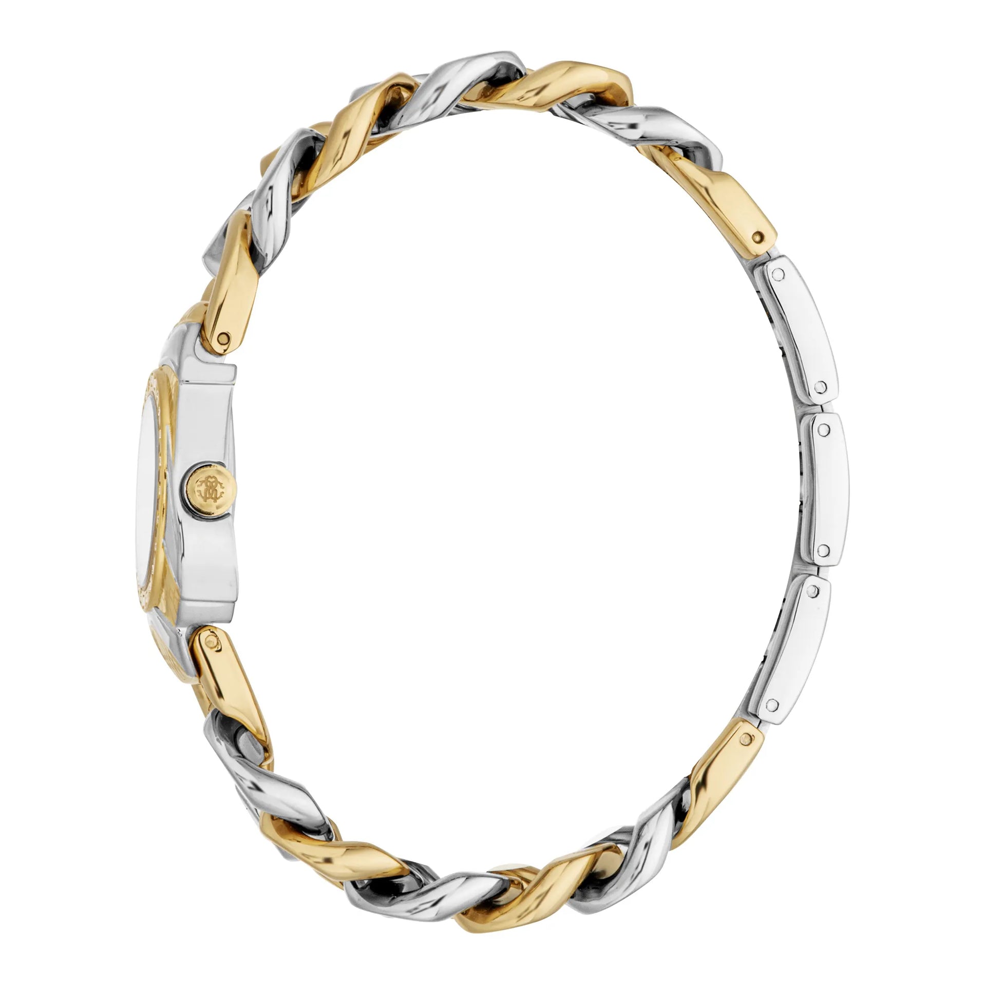 In the world of haute horology, where elegance meets innovation, emerges a timepiece that captures the essence of refined sophistication. Crafted in the heart of Swiss watchmaking tradition, this Roberto Cavalli Lady watch is a testament to the brand's commitment to fashion-forward design and impeccable craftsmanship. The irregular case shape, bathed in a lustrous silver grey, exudes a sense of modernity and grace, making it a perfect accessory for the contemporary woman. Its stainless steel band, also in a matching silver grey, wraps around the wrist with a seamless elegance, secured by a jewelry clasp that speaks to the watch's luxurious nature. The oyster white dial, understated yet captivating, serves as the canvas for the two-hand quartz movement, driven by the precise GL22 caliber. This watch is not just a timekeeping device, it is a statement of style, a reflection of the wearer's discerning taste. With a water resistance of up to 50 meters, it combines practicality with its exquisite design, ensuring it is as functional as it is beautiful. The mineral crystal adds a layer of durability, protecting the dial while maintaining clarity and brilliance. The pull & push crown offers ease of adjustment, allowing the wearer to effortlessly keep time in style. This Roberto Cavalli Lady watch is more than an accessory, it is an embodiment of elegance, a piece that transcends time and trends, capturing the spirit of those who dare to embrace fashion with confidence and grace.