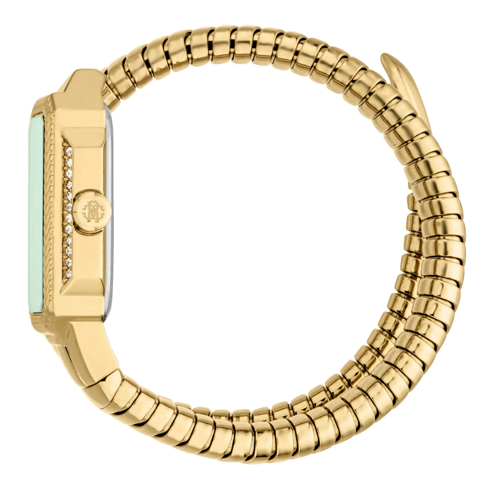 In the world of fashion, where elegance meets audacity, emerges a timepiece that captures the essence of sophistication and style. Crafted in the heart of Swiss watchmaking, this Roberto Cavalli Lady watch is a testament to refined design and exquisite craftsmanship. Its rectangular case, bathed in the opulent glow of yellow gold, exudes a sense of timeless luxury, while the bottle green dial adds a touch of mystery and allure. The mineral crystal face, coupled with a pull & push crown, ensures that this watch is as practical as it is beautiful. The stainless steel band, also in a matching yellow gold hue, wraps around the wrist with a sense of grace and poise, making it the perfect accessory for the modern woman who values both fashion and function. Water-resistant and powered by a precise quartz movement with a GL22 caliber, this watch promises reliability and elegance in every tick. The two-hand display offers a minimalist yet striking look, allowing the vibrant colors and luxurious materials to take center stage. This Roberto Cavalli Lady watch is not just a timepiece, it's a statement of bold femininity and timeless elegance, designed for those who dare to stand out in a world of conformity.