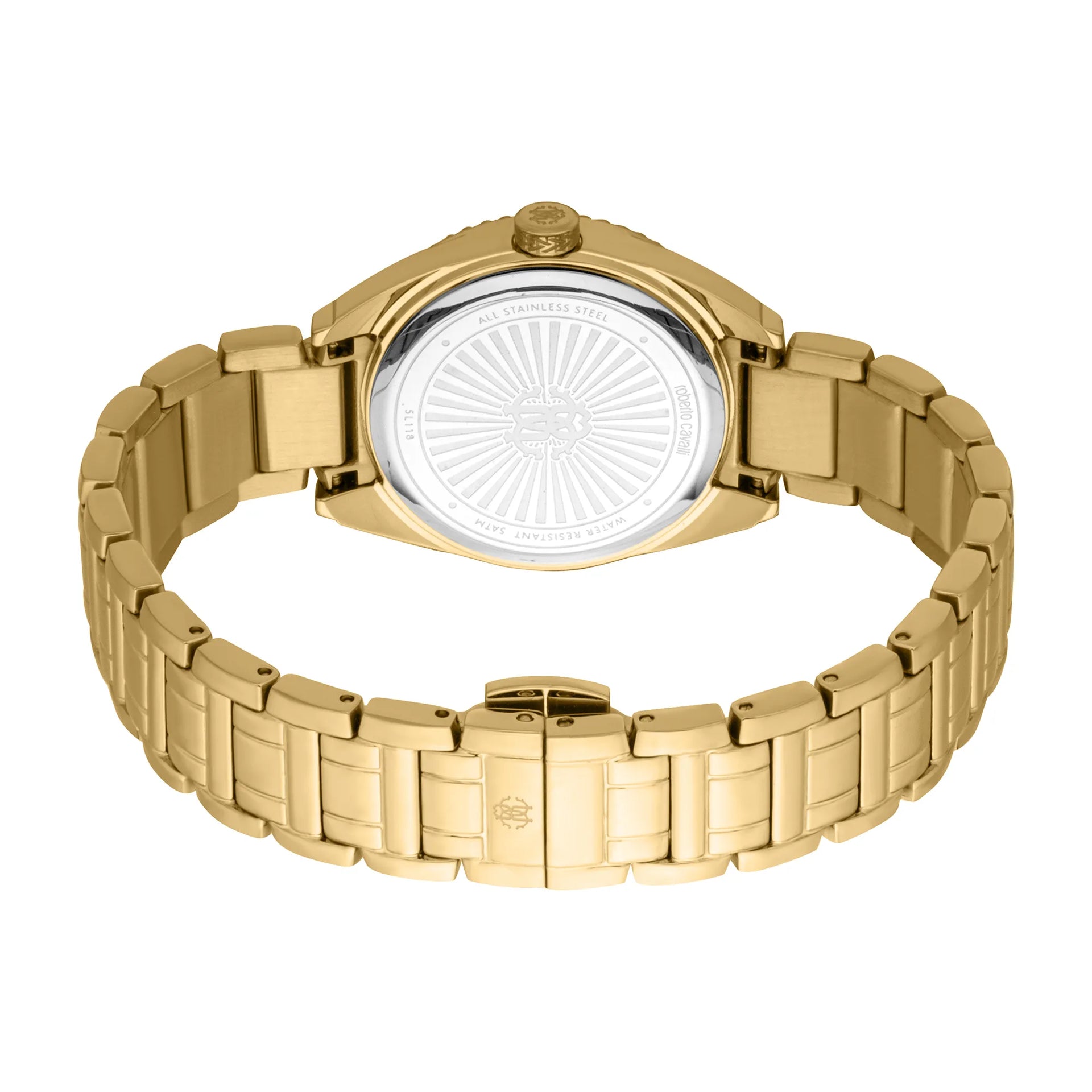 In the world of high fashion, where elegance meets innovation, emerges a timepiece that embodies the essence of sophistication and style. Crafted in the heart of Swiss watchmaking, this Roberto Cavalli Lady watch is a testament to the brand's commitment to luxury and precision. Its round case, bathed in the opulent hue of yellow gold, captures the light with every movement, creating a dazzling display of refinement. With a case diameter of 30mm, it sits gracefully on the wrist, a perfect blend of subtlety and statement. The mineral crystal face protects a silver-grey dial, where three hands dance in perfect harmony, powered by the reliable GL32 quartz movement. The stainless steel band, also in yellow gold, wraps around the wrist with a butterfly deployant clasp, ensuring both security and ease of wear. Water-resistant up to 50 meters, this watch is as practical as it is beautiful, ready to accompany you through life's adventures. The pull & push crown adds a touch of classic charm, inviting you to adjust time with ease. This Roberto Cavalli Lady watch is more than just a timepiece, it's a symbol of timeless elegance, a reflection of the modern woman's grace and strength, destined to be a cherished companion in her journey through life.