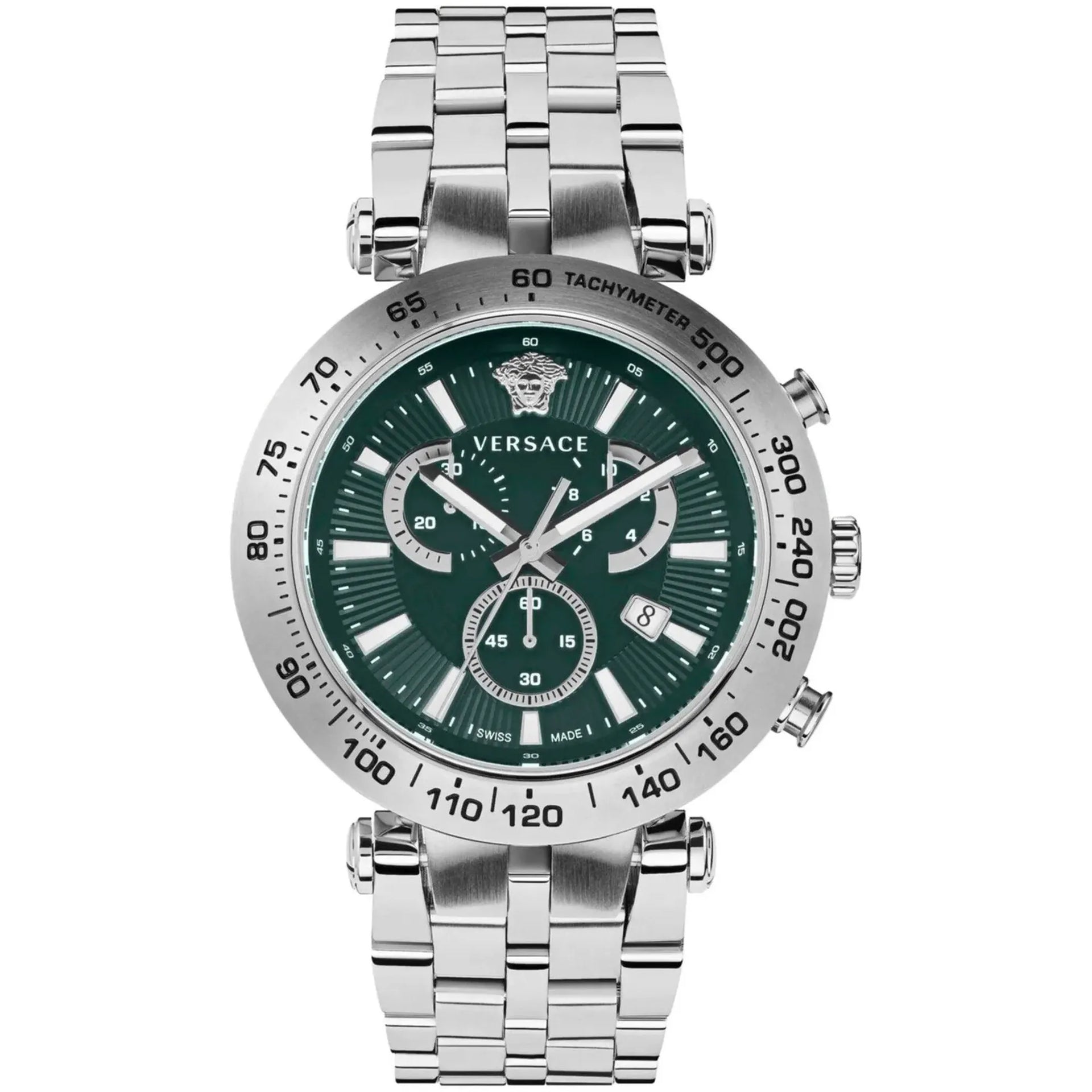 In the world of high fashion, where elegance meets precision, emerges a timepiece that embodies the essence of sophistication and style. Crafted in Switzerland, this Versace watch is a testament to the brand's commitment to excellence and luxury. Its round case, with a refined silver-grey hue, commands attention with a commanding diameter of 46mm, making it a bold statement on any wrist. The bottle green dial, reminiscent of lush forests, adds a touch of mystery and depth, perfectly complemented by the gleaming silver-grey stainless steel band. This watch is not just about aesthetics, it boasts a sapphire crystal that ensures clarity and durability, while the pull & push crown offers seamless functionality. With a water resistance of up to 50 meters, it is as versatile as it is stylish. The butterfly deployant clasp with a push-button ensures a secure fit, making it a reliable companion for any occasion. The chronograph display, powered by precise quartz movement, is a nod to the modern man's need for both form and function. The date calendar feature adds practicality to its allure, making it an indispensable accessory for the fashion-forward gentleman. This Versace watch is more than just a timekeeper, it is a symbol of refined design and timeless elegance, destined to leave a lasting impression.