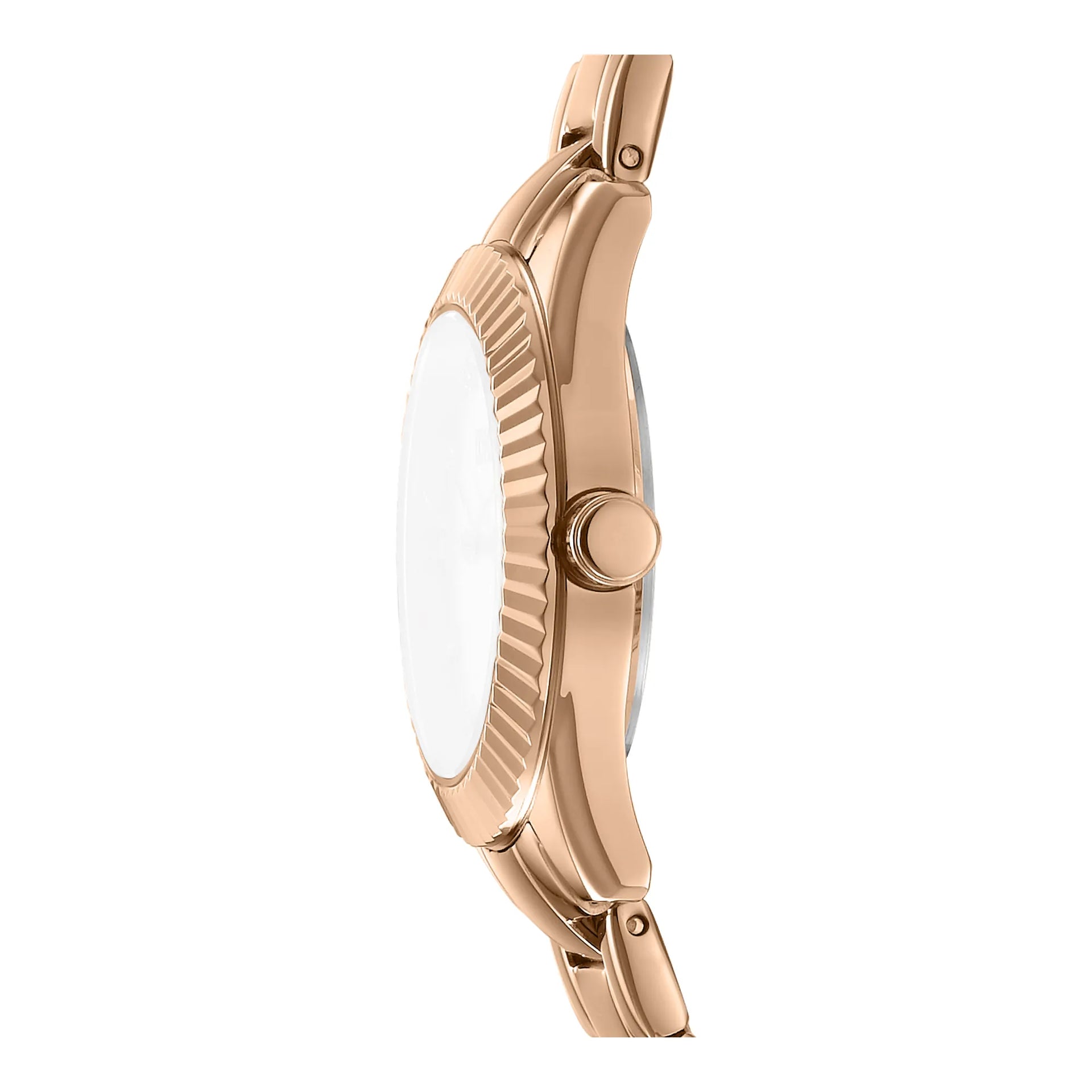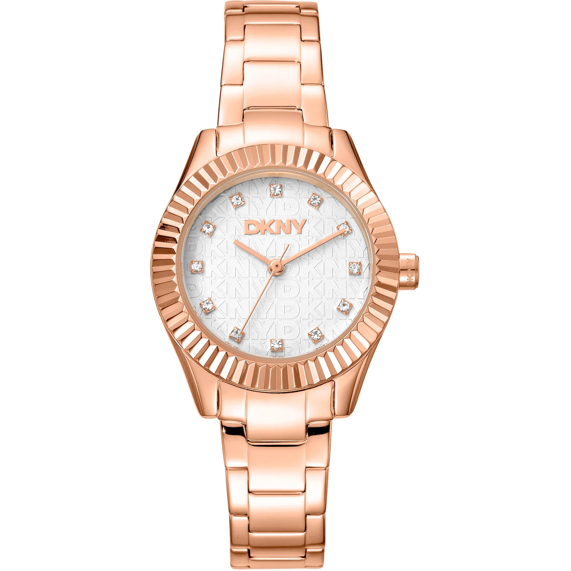 In the heart of urban elegance, where the skyline meets the horizon, the DKNY Chambers Glitz watch emerges as a beacon of sophisticated style. Crafted in a round silhouette, its rose gold case exudes a warm, inviting glow, perfectly complementing the modern woman's fashion-forward sensibilities. With a case diameter of 30mm, this timepiece is a delicate yet striking accessory, designed to make a statement without overwhelming. The mineral crystal face protects a silver-grey dial, where three hands dance gracefully, powered by precise quartz movement. This watch is not just about looks, it offers practicality with a water resistance of up to 50 meters, ensuring it can accompany you through both rain and shine. The stainless steel band, also in rose gold, wraps around the wrist with a refined design, secured by a butterfly deployant clasp with a push-button for ease and comfort. The pull & push crown adds a touch of classic charm, allowing for easy adjustments. This DKNY watch is more than a timepiece, it's a celebration of contemporary femininity, a perfect blend of fashion and function, destined to be a cherished companion for the modern woman who values both elegance and practicality in her everyday adventures.