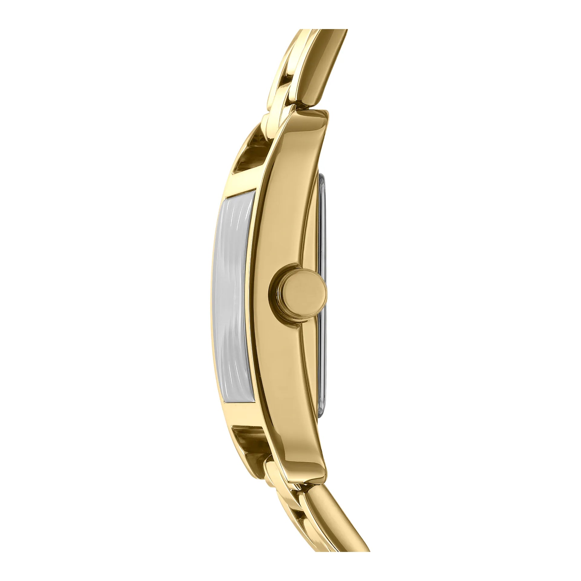 In the bustling heart of the city, where fashion meets function, emerges a timepiece that embodies the essence of urban elegance. The DKNY City Maxi watch is a testament to the modern woman's dynamic lifestyle, seamlessly blending sophistication with practicality. Its rectangular case, bathed in a luxurious yellow gold hue, captures the light with every movement, making it a striking accessory for any occasion. The 29mm case diameter offers a perfect balance between boldness and subtlety, ensuring it stands out without overwhelming. Crafted with precision, this watch is water-resistant, providing peace of mind for those unexpected splashes of city life. The mineral crystal protects the silver-grey dial, where three hands dance gracefully, powered by a reliable quartz movement. The pull & push crown adds a touch of classic charm, while the stainless steel band, also in yellow gold, wraps around the wrist with a refined design. The butterfly deployant clasp with a push-button ensures a secure fit, allowing the wearer to move through her day with confidence and ease. This DKNY watch is not just a timekeeper, it's a statement of style, a reflection of the vibrant cityscape, and a celebration of the modern woman's journey through life.