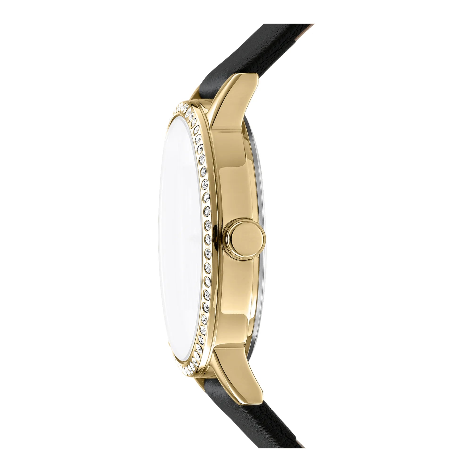 In the bustling heart of New York City, where fashion meets function, emerges a timepiece that embodies the spirit of urban elegance. The DKNY DK1L035 Soho Logo watch is a testament to the modern woman's dynamic lifestyle, seamlessly blending sophistication with practicality. Its round case, bathed in a luxurious yellow gold hue, captures the essence of timeless glamour, while the 36mm diameter ensures a perfect balance between boldness and subtlety. Crafted with a refined design, this watch is water-resistant up to 50 meters, making it as versatile as it is stylish. The mineral crystal face protects a silver-grey dial, where three hands dance gracefully, powered by precise quartz movement. The pull & push crown adds a touch of classic charm, inviting you to adjust time with ease. A black leather band, secured with a tang buckle, wraps comfortably around the wrist, offering a sleek contrast to the golden case. This fashion-forward accessory is more than just a watch, it's a statement of individuality and grace, designed for the woman who navigates the world with confidence and poise. Whether you're attending a high-powered meeting or enjoying a leisurely brunch, this DKNY watch is the perfect companion, reflecting the vibrant energy and sophistication of the city that never sleeps.
