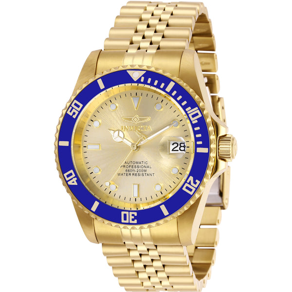 Embrace the spirit of adventure with the Invicta Pro Diver. This casual, automatic timepiece for men is more than an accessory, it's a statement of confidence. Its striking yellow gold and blue tones capture attention, while the transparent case back reveals its intricate mechanical heart. Feel the power on your wrist, ready for every challenge. Imagine it glinting under the sun, a testament to your bold journey.