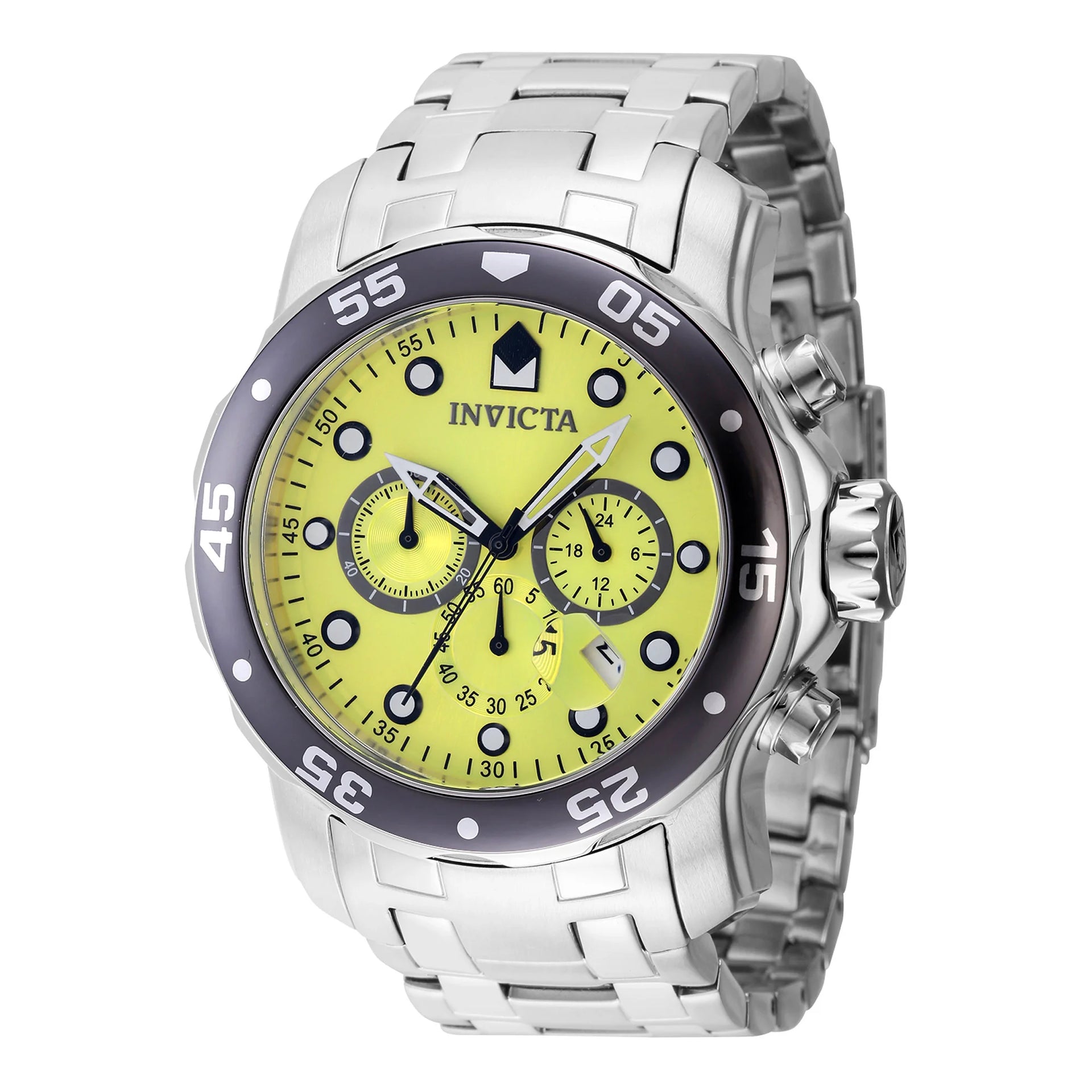 In the world of timepieces, where precision meets elegance, the Invicta Pro Diver emerges as a beacon of style and functionality. Crafted in the heart of horological excellence, this watch is a testament to refined design and meticulous craftsmanship. Its round case, bathed in a sophisticated silver grey, commands attention with a commanding 48mm diameter, making it a bold statement on any wrist. The stainless steel band, matching the case in its silver grey hue, wraps around the wrist with a sense of timeless elegance, secured by a folding deployant clasp with a safety lock for added peace of mind. Beneath the hardlex crystal, the vibrant yellow dial bursts forth with a pop of color, infusing a playful yet daring element into its casual style. This chronograph watch, powered by precise quartz movement, not only tells time but also offers a date calendar, ensuring you stay on schedule with flair. With a water resistance of up to 200 meters, it is a trusted companion for those who dare to explore the depths. The pull and push crown adds a touch of classic charm, allowing for easy adjustments. The Invicta Pro Diver is more than just a watch, it is a statement of confidence and sophistication, designed for the modern man who values both form and function.