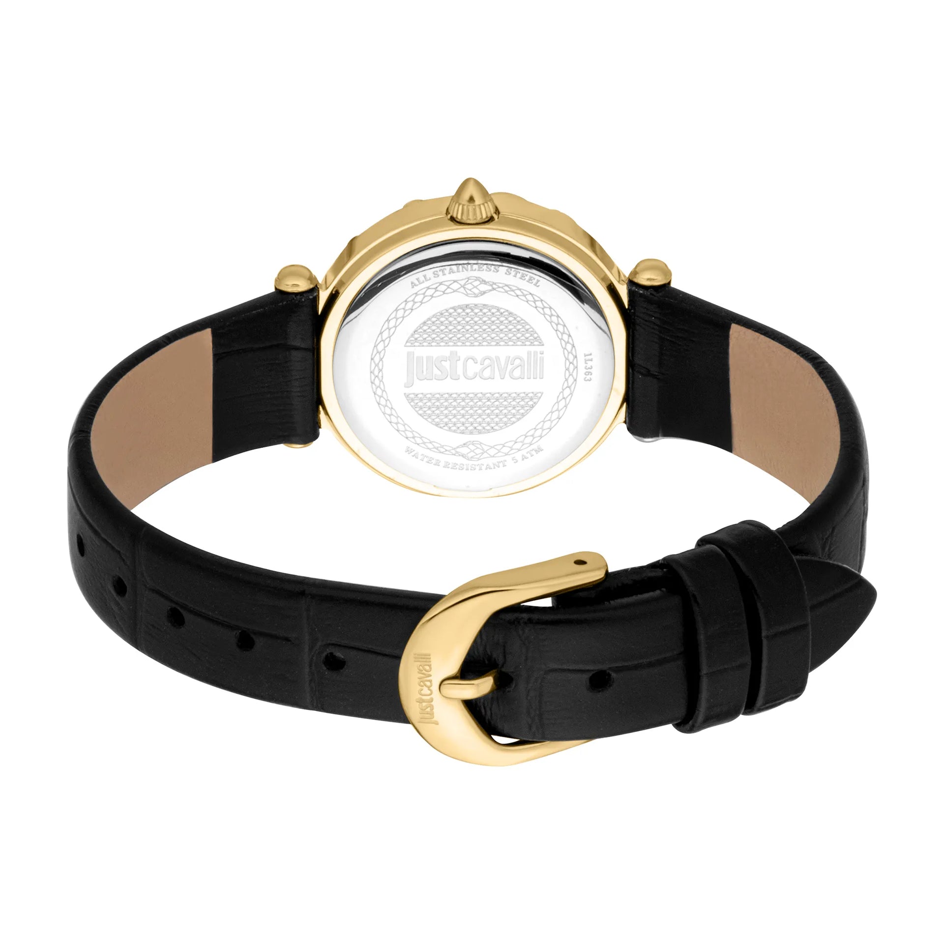In the realm of fashion, where elegance meets audacity, emerges a timepiece that captures the essence of bold sophistication. Crafted in the heart of Swiss watchmaking, this Just Cavalli Watch from the illustrious Animalier collection is a testament to the brand's daring spirit. The round case, bathed in a luxurious yellow gold hue, exudes an aura of opulence, perfectly complementing the refined design that defines this exquisite accessory. With a case diameter of 28mm, it sits gracefully on the wrist, a subtle yet striking statement of style. The silver-grey dial, reminiscent of moonlit nights, is a canvas of elegance, where three hands dance gracefully, powered by precise quartz movement. The mineral crystal offers a clear view, while the pull & push crown ensures seamless time adjustments. Encircling the wrist is a sleek black leather band, its supple texture a testament to timeless fashion. The tang buckle closure adds a touch of classic charm, ensuring a secure fit for the modern woman who embraces both fashion and function. Water-resistant up to 50 meters, this watch is as versatile as it is beautiful, ready to accompany its wearer from the bustling city streets to serene seaside escapes. With a weight of just 24 grams, it offers a lightweight experience without compromising on style. This Just Cavalli Watch is not just an accessory, it's a bold declaration of character, a fusion of elegance and audacity that speaks to the fearless spirit of those who dare to stand out.