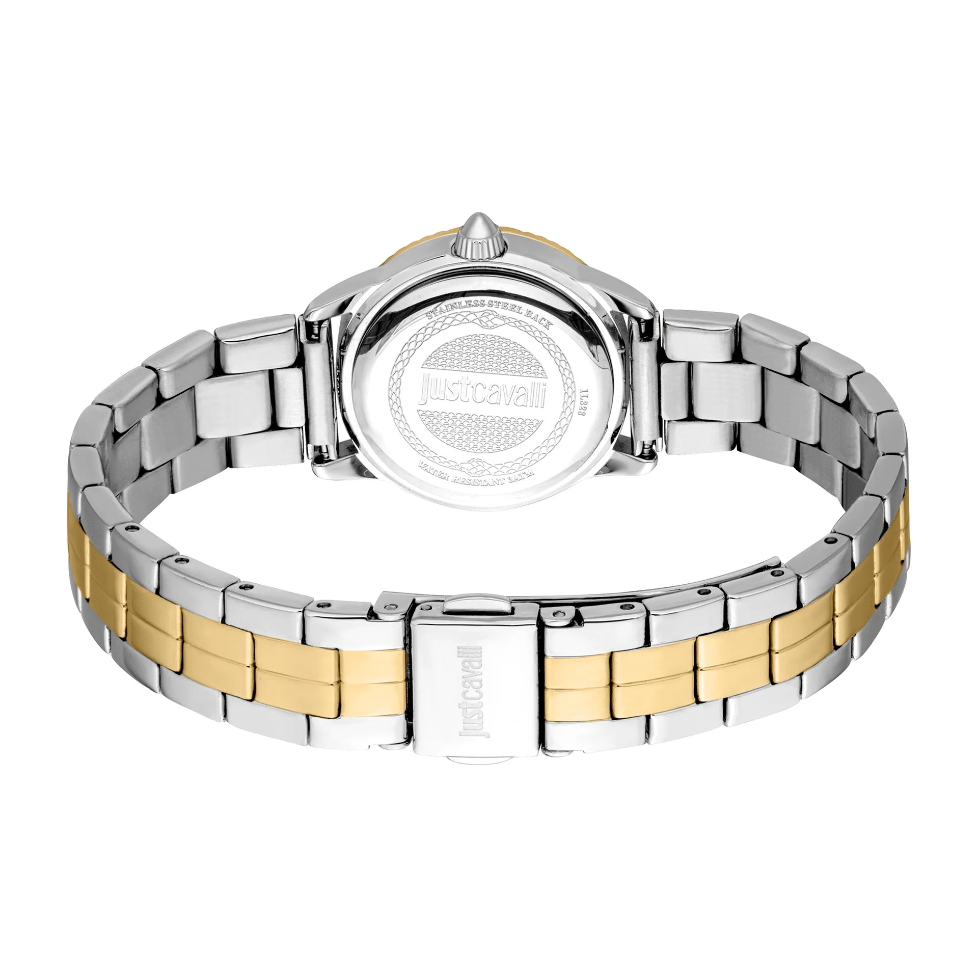 In the world of fashion, where elegance meets innovation, emerges a timepiece that embodies sophistication and style. This Just Cavalli Watch, from the JC1L328 Mini Raffinata collection, is a testament to the brand's commitment to exquisite design and craftsmanship. Crafted in a sleek, round silhouette, the silver-grey case exudes a timeless allure, perfectly complementing the refined stainless steel band. The folding deployant clasp with a push-button ensures a seamless fit, making it a perfect accessory for the modern woman who values both form and function. The champagne-colored dial, reminiscent of a golden sunset, adds a touch of opulence, while the three-hand quartz movement ensures precision and reliability. Water-resistant and adorned with a mineral crystal, this watch is designed to withstand the rigors of daily life while maintaining its elegant charm. The pull & push crown offers ease of use, making it a practical yet stylish choice for any occasion. With its fashion-forward design and impeccable attention to detail, this Just Cavalli Watch is more than just a timepiece, it's a statement of grace and sophistication, capturing the essence of contemporary femininity.