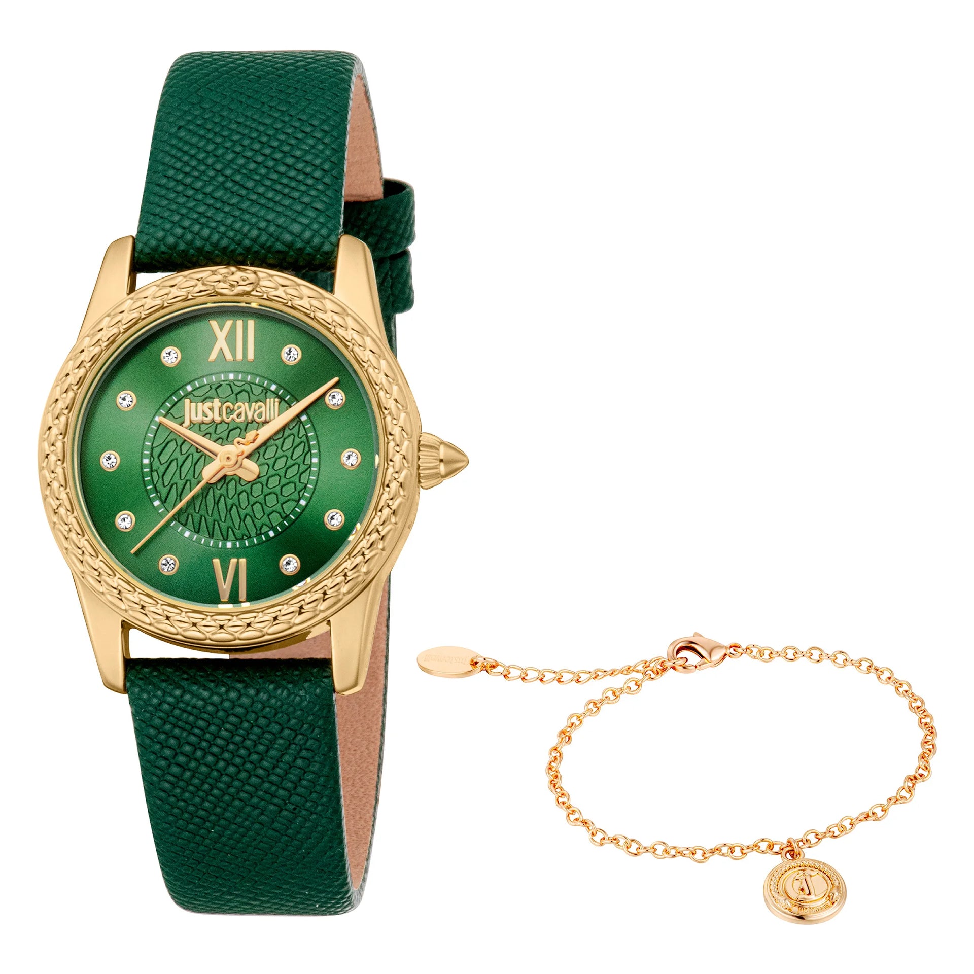 In the realm of fashion, where elegance meets audacity, emerges a timepiece that captures the essence of sophistication and boldness. Crafted in the heart of Swiss watchmaking, this Just Cavalli Watch from the JC1L360 Sublime Animalier collection is a testament to refined design and exquisite taste. The round case, bathed in a luxurious yellow gold hue, exudes an aura of opulence, perfectly complementing the vibrant bottle green leather band. This harmonious blend of colors creates a striking visual contrast, making it a true statement piece for the modern woman. The dial, also in a captivating bottle green, is a canvas of elegance, where the three-hand display dances gracefully under the protection of a mineral crystal. With a case diameter of 30mm, it sits delicately on the wrist, offering both comfort and style. The tang buckle closure ensures a secure fit, while the pull & push crown adds a touch of practicality to its design. Water-resistant and powered by precise quartz movement, this watch is not just an accessory but a companion for every adventure. Embrace the allure of fashion with this exquisite timepiece, where every glance at your wrist is a reminder of the bold and the beautiful.