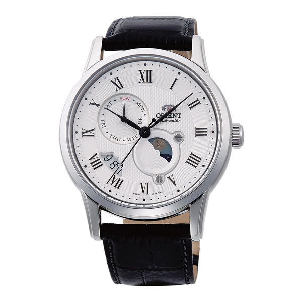 In the realm of horology, where time is both a science and an art, the ORIENT Classic AK00 Sun & Moon emerges as a testament to timeless elegance and mechanical mastery. Crafted with precision, this watch is a harmonious blend of tradition and innovation, designed for the discerning gentleman who appreciates the finer things in life. Its round case, bathed in a sophisticated silver grey, encases a world of intricate mechanics visible through a transparent back, inviting you to marvel at the dance of its 22 jewels. The white dial, a canvas of purity, is adorned with a day and date calendar, offering a glimpse into the celestial ballet of the sun and moon. This classic timepiece is not just about telling time, it's about experiencing it. The mechanical movement, powered by the F6B24 caliber, ensures accuracy with a daily precision of +25/-15 seconds, while the option for both hand-winding and automatic movement caters to the connoisseur's preference. Encased in sapphire crystal, the watch is a fortress against the elements, boasting a water resistance of up to 50 meters. The black leather band, secured with a folding deployant clasp with a push-button, wraps around the wrist with a promise of comfort and style. This ORIENT watch is more than an accessory, it's a statement of refined taste and a companion for those who navigate the world with grace and confidence.