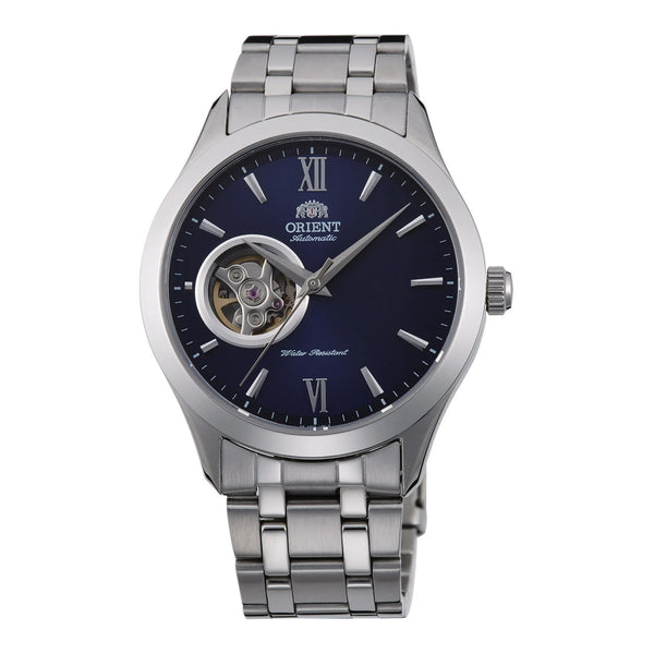In the realm of timepieces, where elegance meets functionality, emerges a creation that captures the essence of modern sophistication. Crafted in the heart of horological excellence, the ORIENT AG03 Open Heart watch from the ORIENT Contemporary collection is a testament to refined design and meticulous craftsmanship. Its round case, bathed in a sleek silver-grey hue, encases a mesmerizing blue dial that evokes the serene depths of the ocean. This watch is not just a timekeeper, it's a statement of style for the discerning gentleman who appreciates the art of casual elegance. The transparent back offers a glimpse into the intricate dance of its mechanical movement, powered by the F6T22 caliber with 22 jewels, ensuring precision with a daily accuracy of +25/-15. The stainless steel band, matching the case in its silver-grey allure, wraps around the wrist with a folding deployant clasp, offering both security and ease of wear. With a water resistance of up to 50 meters, this timepiece is as versatile as it is beautiful, ready to accompany you from the boardroom to a weekend getaway. The pull & push crown and mineral crystal add to its durability, while the hand-wound and automatic features speak to its advanced engineering. This ORIENT watch is more than an accessory, it's a companion for the modern man who values both tradition and innovation, a perfect blend of timeless design and contemporary flair.