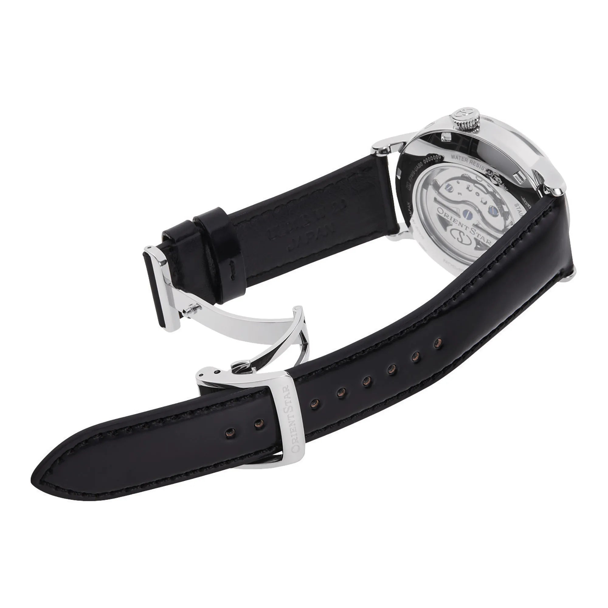 Embrace timeless elegance with the ORIENT STAR Classic Moon Phase. This exquisite men's timepiece isn't just an accessory, it's a statement of refined identity. Its captivating dial, revealing the celestial dance, elevates every moment. Crafted with a sophisticated black leather strap and a mesmerizing transparent case back, it whispers tales of precision and legacy. Picture it gracing your wrist during an unforgettable evening, reflecting your discerning taste.