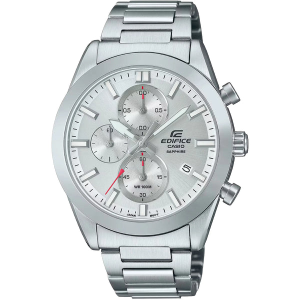 In the realm of timekeeping, where precision meets elegance, emerges a masterpiece that embodies the spirit of modern sophistication. Crafted with meticulous attention to detail, this Casio Edifice watch is a testament to the art of horology. Its round case, bathed in a sleek silver grey hue, exudes a refined design that captures the essence of contemporary style. With a case diameter of 41mm, it strikes the perfect balance between presence and subtlety, making it an ideal companion for the discerning gentleman. The sapphire crystal, known for its durability and clarity, protects the intricate chronograph display, ensuring that every second is captured with unparalleled accuracy. The silver grey stainless steel band, secured with a folding deployant clasp featuring a push-button and safety lock, offers both comfort and security, making it suitable for any occasion. Water-resistant up to 100 meters, this timepiece is as versatile as it is elegant, ready to accompany you from the boardroom to the beach. The pull & push crown adds a touch of classic charm, while the date calendar function ensures you stay on top of your schedule. Powered by a precise quartz movement, this watch is a celebration of both form and function. The chronograph feature, seamlessly integrated into the design, adds a layer of sophistication, allowing you to measure time with precision. In a world where style and functionality often collide, this Casio Edifice watch stands as a beacon of harmony, a true reflection of the modern man's lifestyle.