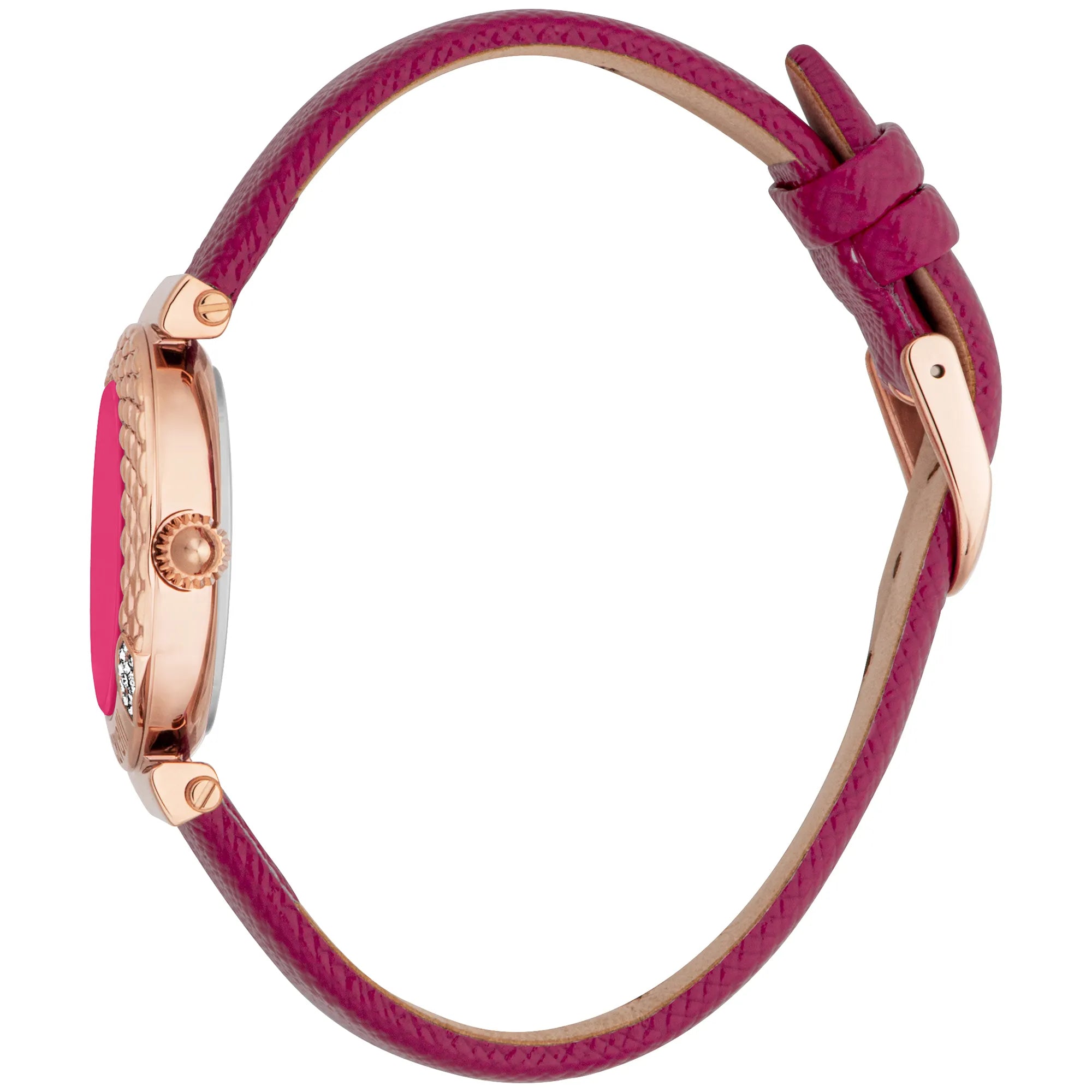In the realm of fashion, where elegance meets audacity, emerges a timepiece that captures the essence of modern femininity with a touch of daring flair. Crafted in the heart of style innovation, this Just Cavalli Watch from the JC1L332 Curiosa collection is a testament to the brand's commitment to bold design and exquisite craftsmanship. The round case, bathed in a luxurious rose gold hue, exudes a sense of timeless sophistication, while its 30mm diameter ensures a delicate yet striking presence on the wrist. The heather violet leather band, paired with a matching dial, introduces a pop of color that speaks to the vibrant spirit of contemporary fashionistas. This harmonious blend of hues is not just a visual delight but a statement of individuality and confidence. The mineral crystal protects the dial, ensuring clarity and durability, while the pull & push crown offers ease of adjustment. With a water resistance of up to 50 meters, this watch is as practical as it is stylish, ready to accompany you through life's adventures. The quartz movement guarantees precision, and the three-hand display provides a classic touch to this modern masterpiece. Secured with a tang buckle, this watch is not just an accessory but a companion that celebrates the audacious spirit of those who dare to stand out.