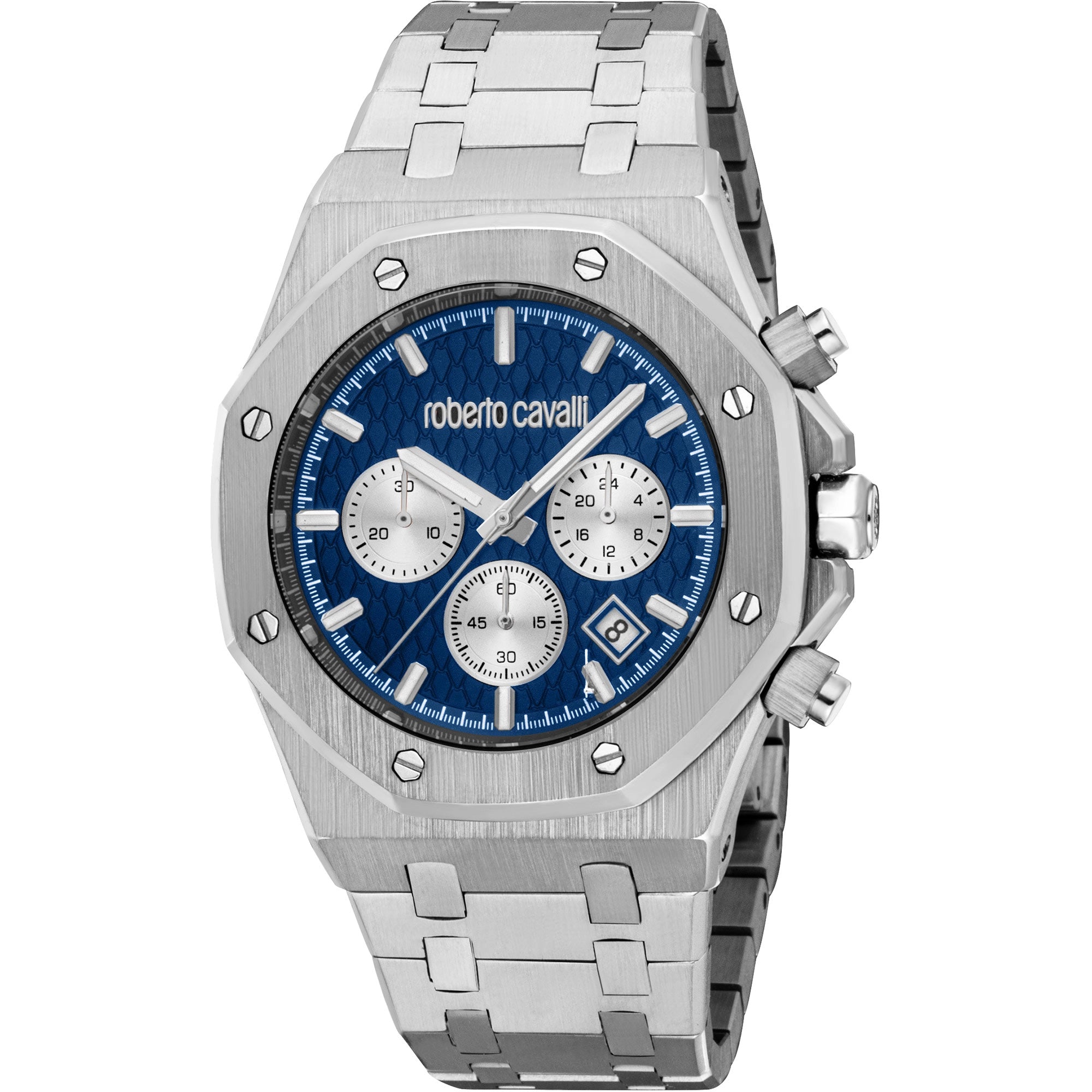 As an authentic creation from the Roberto Cavalli Gent family, model RC5G161M0055, this luxury men's chronograph watch embodies modern Italian fashion and impeccable craftsmanship. It comes complete with original Roberto Cavalli packaging, ensuring an unboxing experience as premium as the watch itself. Discover this stunning blue dial stainless steel watch and more luxury timepieces at Watchello.com.