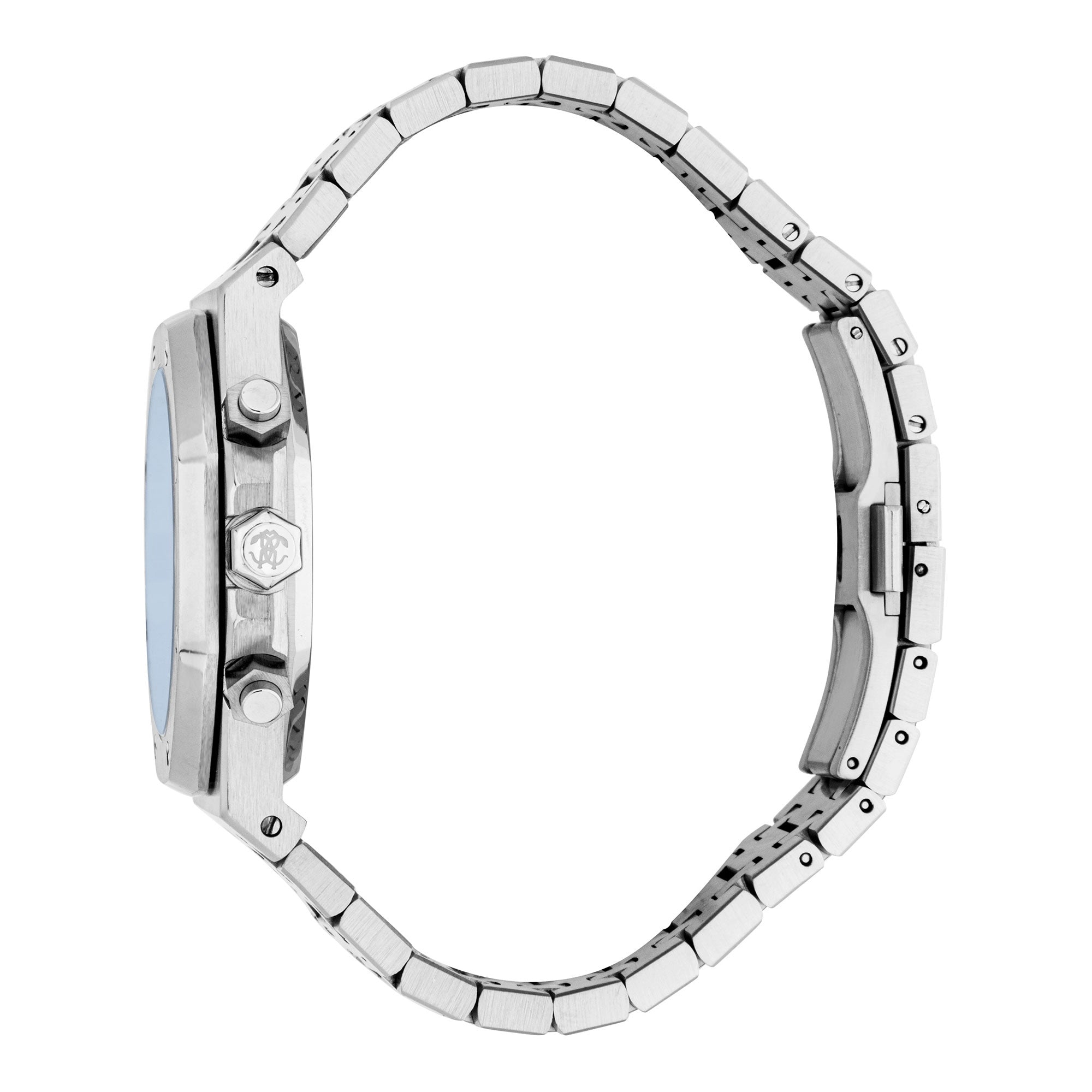 At its heart, this Roberto Cavalli watch is powered by a reliable CITIZEN JS25 quartz movement. This advanced movement boasts a chronograph display, a useful date function, a stopwatch, and a 24-hour time indicator, offering comprehensive timekeeping capabilities.