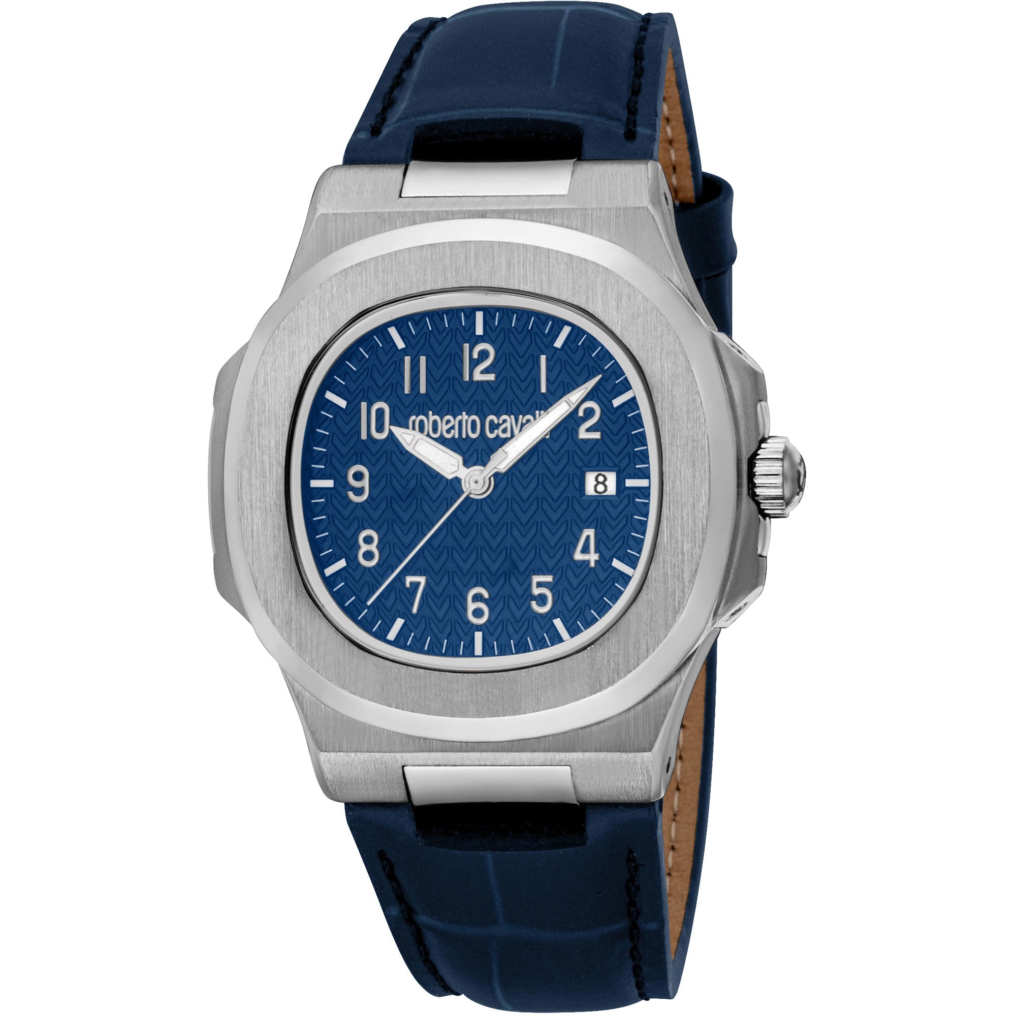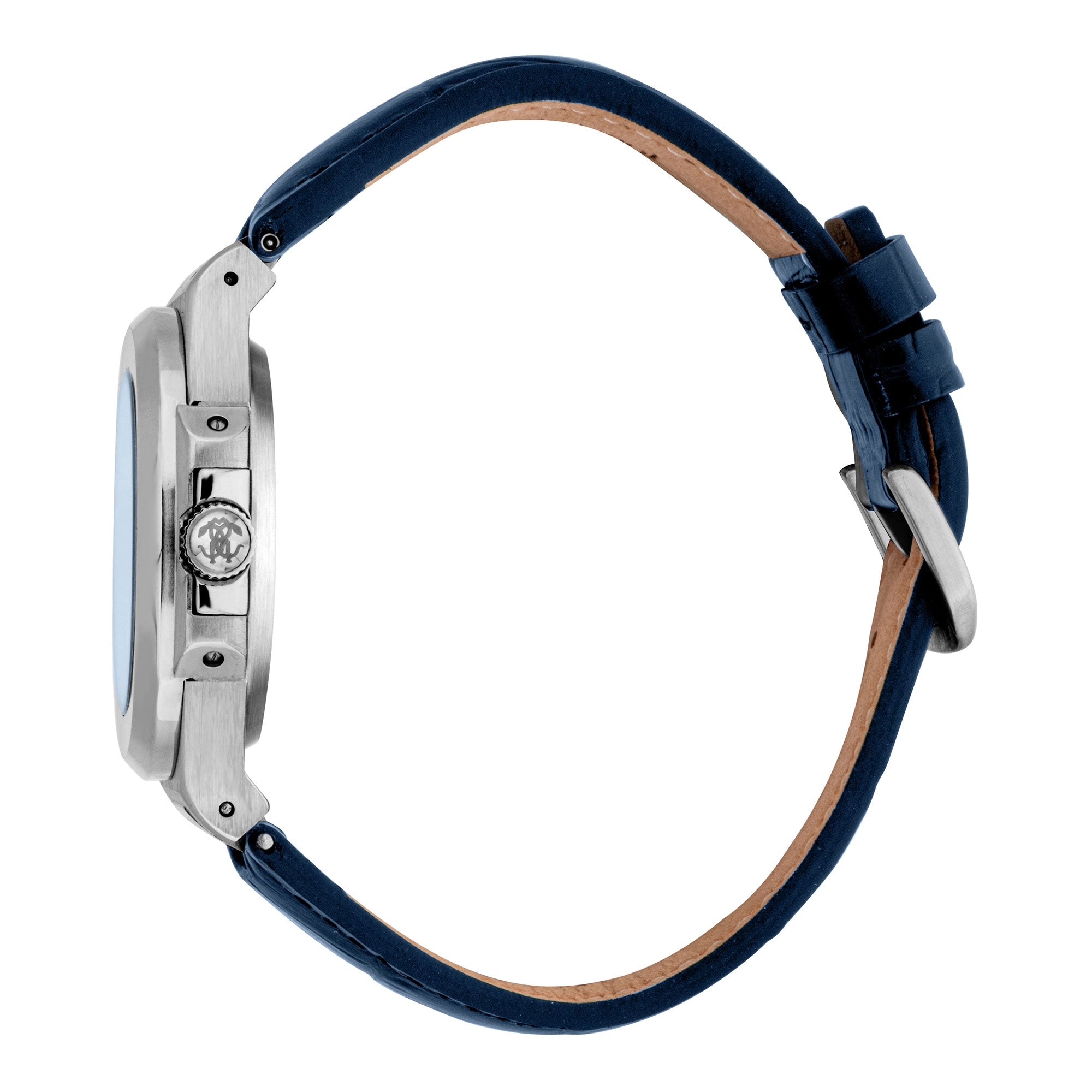 Discover the Roberto Cavalli Gent RC5G166L0025, a sophisticated men's fashion watch designed for the modern adult. This striking timepiece boasts a substantial 43mm round case crafted from durable silver grey stainless steel, perfectly paired with an elegant night blue leather strap that secures with a classic tang buckle.
