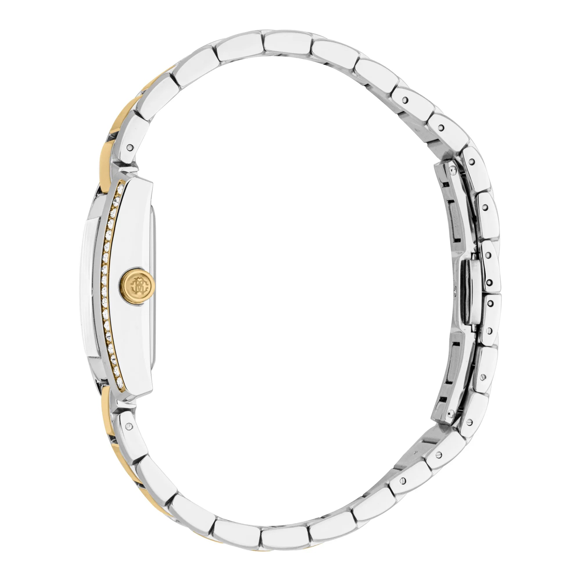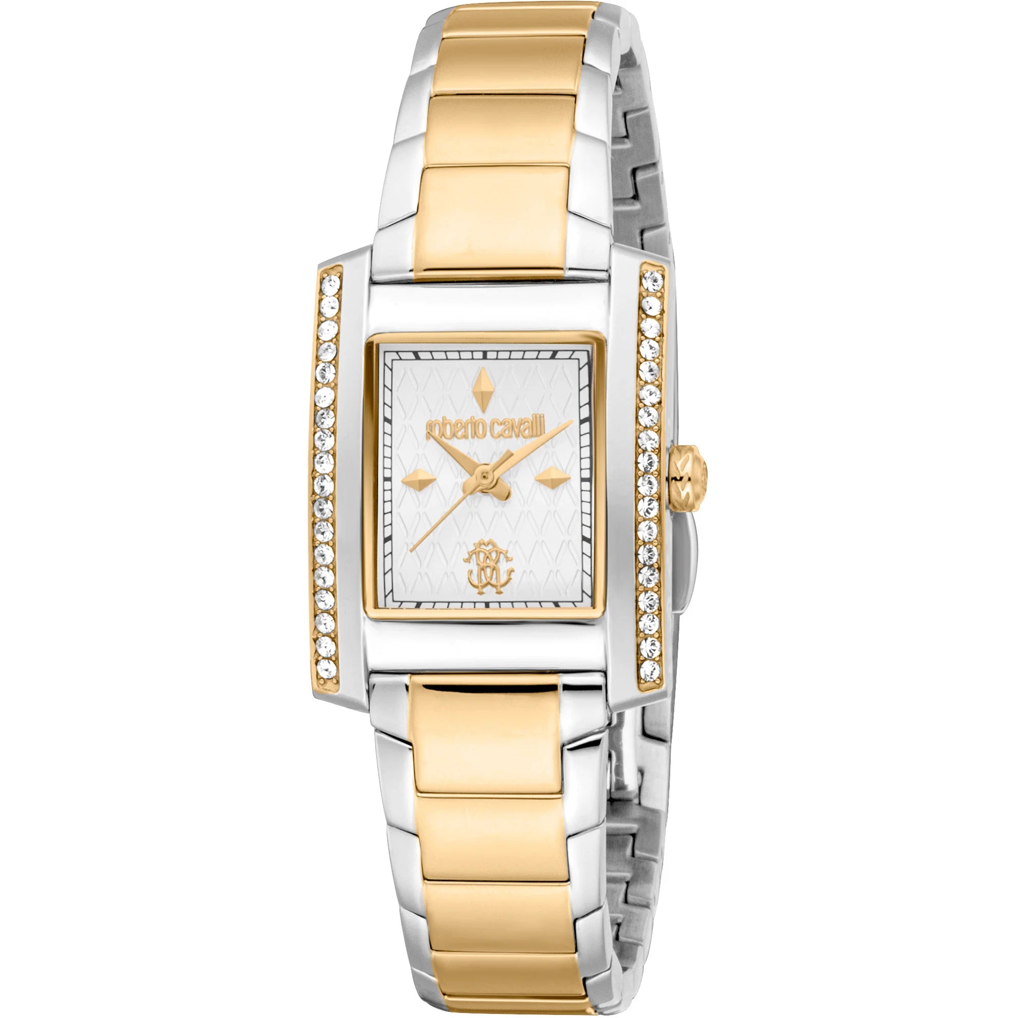 In the world of high fashion, where elegance meets innovation, emerges a timepiece that embodies the essence of sophistication and style. Crafted in the heart of Swiss watchmaking excellence, this Roberto Cavalli Lady watch is a testament to refined design and timeless allure. The rectangular case, bathed in a sleek silver grey hue, exudes a modern yet classic charm, perfectly complementing the graceful wrist of the contemporary woman. Its mineral crystal face offers a clear window to the world of precision, where the three-hand quartz movement, powered by the GL34 caliber, ensures impeccable timekeeping. The dial, in a harmonious silver grey, reflects a subtle elegance that resonates with the fashion-forward spirit. Encircling the wrist is a luxurious stainless steel band, plated in a radiant yellow gold, adding a touch of opulence to every glance. The butterfly deployant clasp with a push-button closure not only ensures a secure fit but also enhances the watch's seamless design. Water-resistant, this watch is as practical as it is beautiful, ready to accompany its wearer through life's myriad adventures. With a weight of just 83 grams, it offers a comfortable yet substantial presence, making it the perfect accessory for any occasion. This Roberto Cavalli Lady watch is more than just a timepiece, it is a statement of elegance, a celebration of femininity, and a symbol of the enduring allure of fashion.