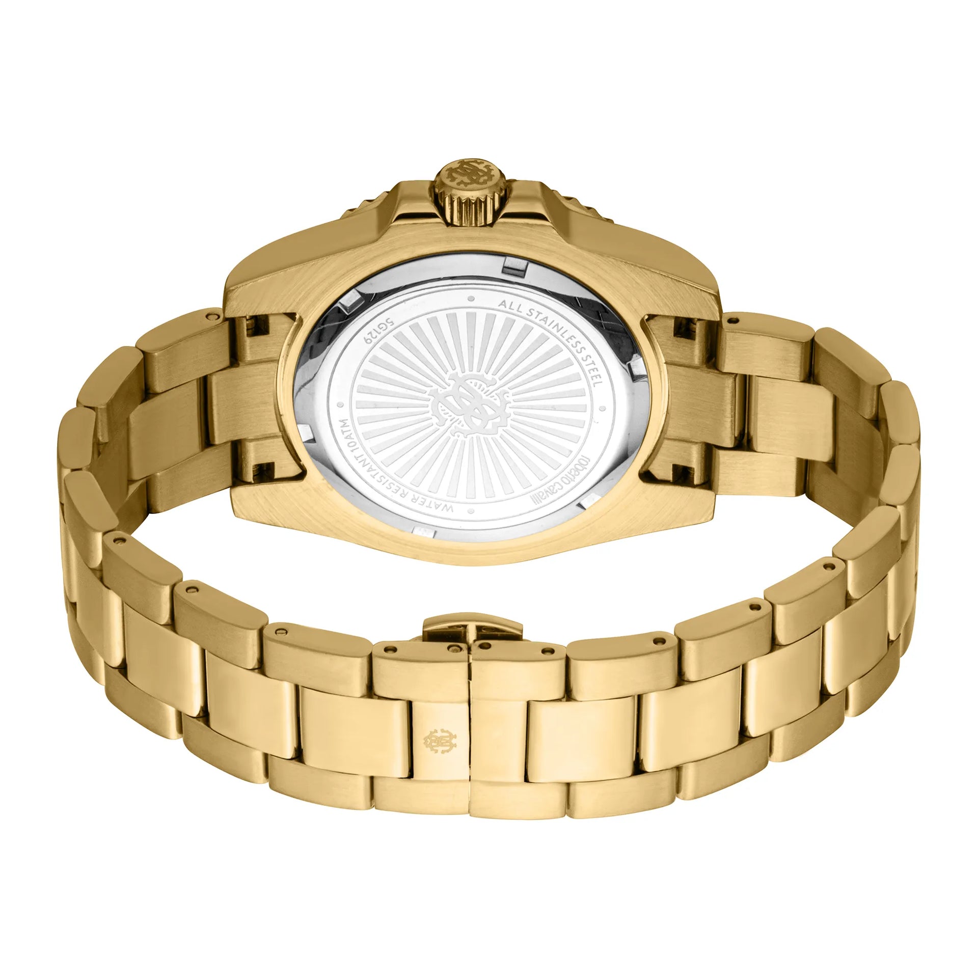 In der Welt der Uhrmacherkunst, wo Eleganz auf Präzision trifft, entsteht eine Uhr, die das Wesen von Raffinesse und Stil verkörpert. Gefertigt im Herzen der Schweizer Uhrmacherei, ist diese Roberto Cavalli Gent Uhr ein Zeugnis für das Engagement der Marke für Luxus und Mode. Das runde Gehäuse, getaucht in einen strahlenden Gelbgoldton, zieht mit seinem Durchmesser von 41 mm die Blicke auf sich und bietet eine perfekte Balance zwischen Kühnheit und Zurückhaltung. Das Mineralglas schützt ein auffälliges schwarzes Zifferblatt, auf dem die Zeit mit Präzision von einem Quarzwerk angezeigt wird, das jede Sekunde mit Anmut festhält. Die Datumsanzeige fügt diesem modischen Stück einen Hauch von Praktikabilität hinzu. Das Edelstahlarmband, ebenfalls in Gelbgold, schmiegt sich mit einem Gefühl von raffinierter Eleganz um das Handgelenk und wird durch eine Butterfly-Faltschließe mit Druckknopf für Komfort und einfache Handhabung gesichert. Bis zu 50 Meter wasserdicht, ist diese Uhr nicht nur ein Stil-Statement, sondern auch ein Begleiter für die Abenteuer des Lebens. Die Pull & Push-Krone verleiht einen klassischen Touch und ermöglicht einfache Einstellungen. Diese Just Cavalli Uhr ist mehr als ein Accessoire, sie ist eine Erklärung des Geschmacks und ein Symbol für die Reise des modernen Gentlemans durch die Zeit.