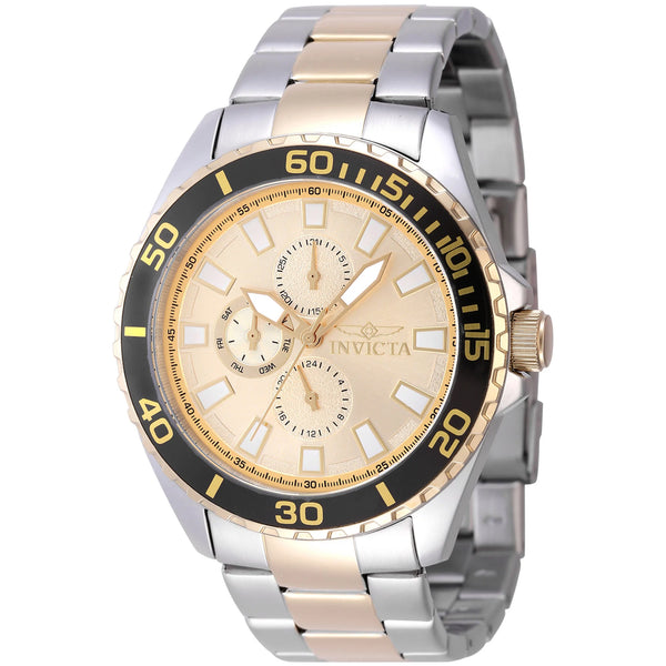In der Welt der Zeitmesser, in der Eleganz auf Funktionalität trifft, erscheint die Invicta Pro Diver als ein Leuchtturm des Stils und der Präzision. In einem raffinierten Design gefertigt, ist diese Uhr ein Zeugnis der Uhrmacherkunst, die lässige Raffinesse nahtlos mit alltäglicher Praktikabilität verbindet. Das runde Gehäuse, getaucht in ein elegantes Silbergrau, zieht mit seinem beeindruckenden Durchmesser von 46 mm alle Blicke auf sich und setzt an jedem Handgelenk ein mutiges Statement. Das gelbgoldene Edelstahlarmband, gesichert mit einer Faltschließe und Sicherheitsverschluss, verleiht einen Hauch von Opulenz und sorgt für Komfort und Sicherheit. Das Zifferblatt, ein strahlendes Gelbgold, fängt die Essenz von Luxus ein, während das Multifunktionsdisplay, angetrieben von einem präzisen Quarzwerk, sowohl Tages- als auch Datumsfunktionen bietet und sicherstellt, dass Sie stilvoll im Zeitplan bleiben. Das Hardlex-Glas bietet eine klare Sicht auf das Zifferblatt, während die Pull-&-Push-Krone einfache Einstellungen ermöglicht. Mit einer Wasserdichtigkeit von bis zu 50 Metern ist diese Uhr ebenso vielseitig wie elegant und bereit, Sie vom Konferenzraum bis zum Strand zu begleiten. Die Invicta Pro Diver ist nicht nur eine Uhr, sondern ein Statement für raffinierten Geschmack und zeitlose Eleganz, perfekt für den modernen Mann, der sowohl Form als auch Funktion schätzt.
