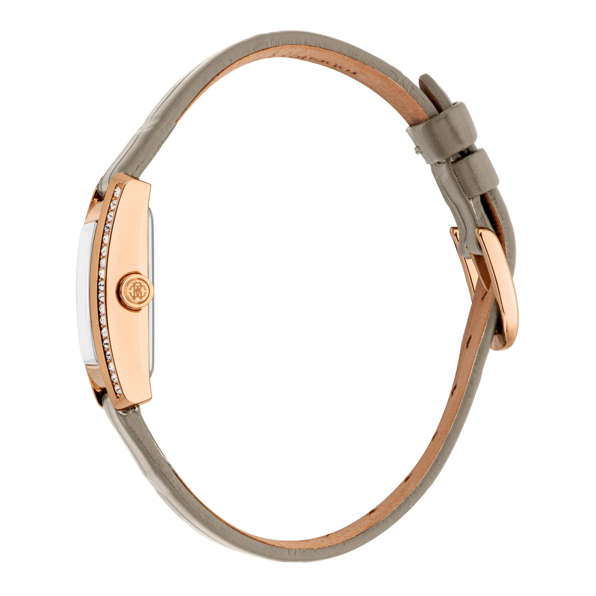 Die Roberto Cavalli Lady Uhr in Roségold ist eine Vision von Eleganz. Ihr rechteckiges Gehäuse und das silbergraue Zifferblatt werden wunderschön von einem hellgrauen Lederarmband ergänzt, das eine harmonische Verbindung von modernem Stil und zeitloser Anmut schafft.