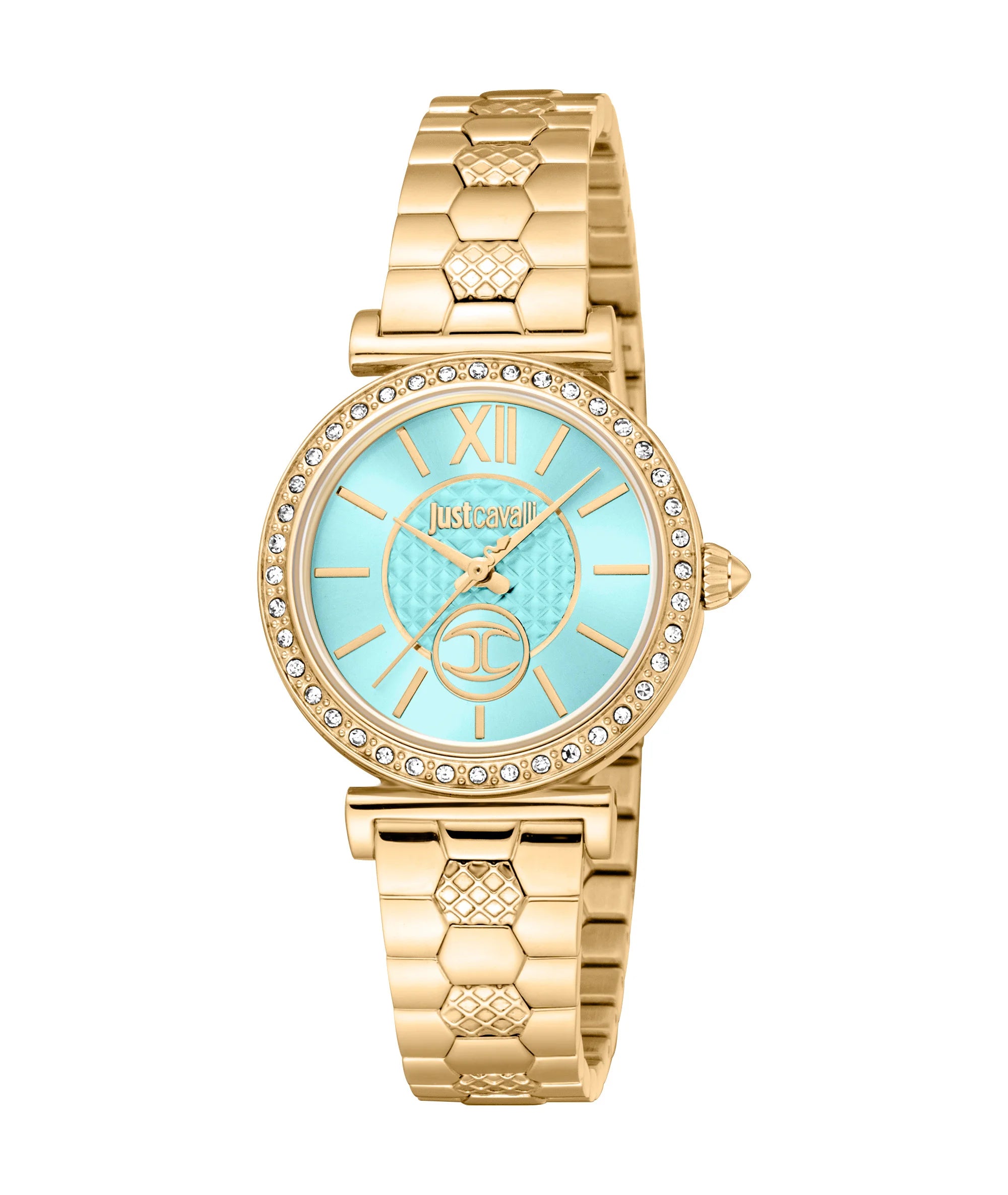 Tauchen Sie ein in die lebendige Anziehungskraft der Just Cavalli Varenna, wo ein türkisfarbenes Zifferblatt auf ein 30mm Gehäuse aus Gelbgold trifft. Diese Modeikone aus dem Just Cavalli SET verfügt über ein Edelstahlarmband und eine Faltschließe mit Schmetterlingsverschluss und bietet eine Wasserdichtigkeit von bis zu 50 Metern.