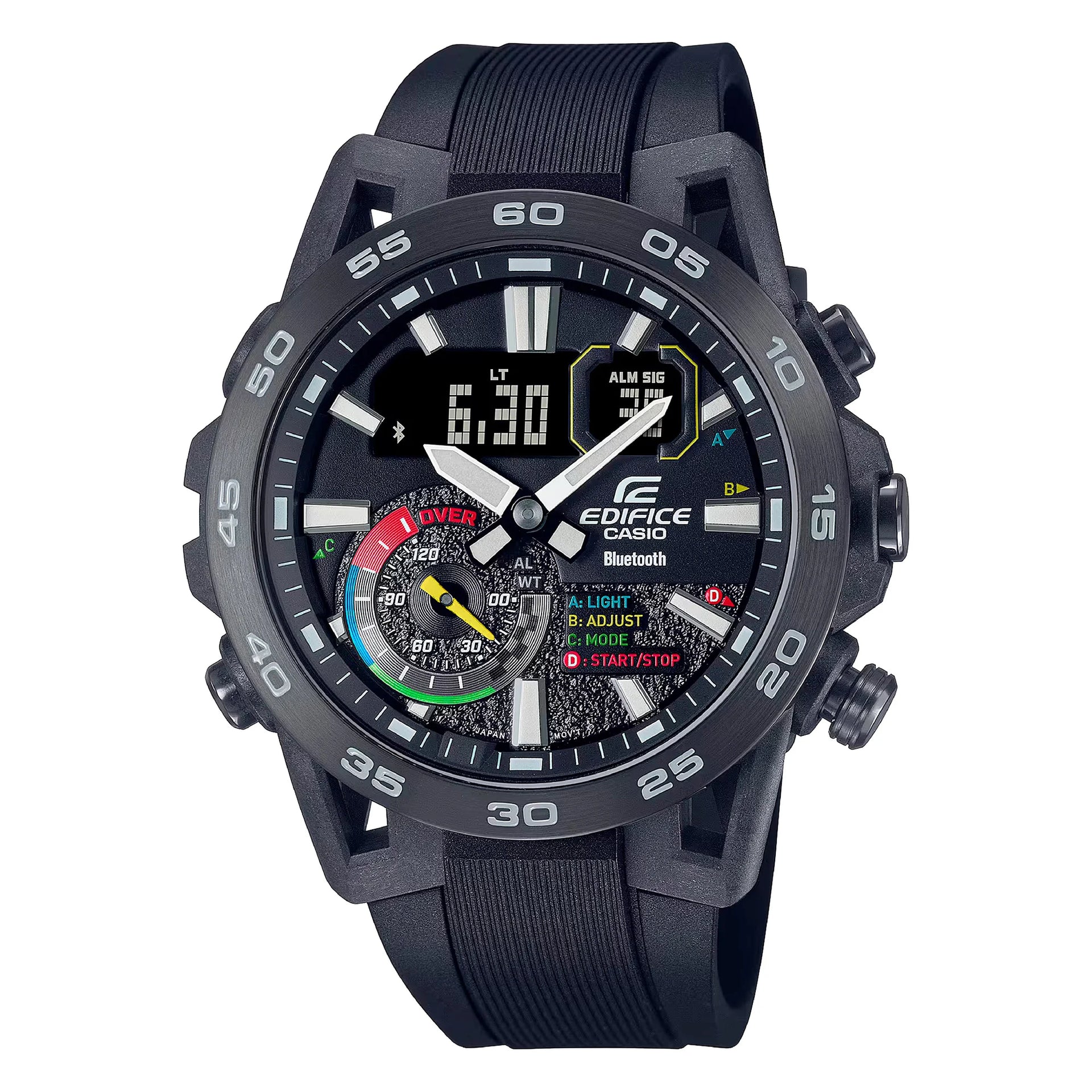 In the realm of timekeeping, where precision meets style, emerges a masterpiece from the CASIO Edifice collection. Crafted for the modern man who values both functionality and flair, this watch is a testament to refined design and innovative technology. Its round case, cloaked in a sleek black hue, commands attention with a commanding 48mm diameter, making it a bold statement on any wrist. The mineral crystal shields the intricate analogue-digital display, a harmonious blend of tradition and modernity. With a water resistance of up to 100 meters, this timepiece is as adventurous as its wearer, ready to accompany you from the boardroom to the beach. The black resin band, secured with a tang buckle, offers both comfort and durability, ensuring it remains a steadfast companion through life's journeys. Inside, the quartz movement, powered by the Caliber 5708, orchestrates a symphony of features: a chronograph for precision timing, an alarm to keep you punctual, a timer for your daily tasks, and world time for the global traveler. The dial, a deep black canvas, is a playground of functionality, featuring a date and month calendar, 24-hour time, and a light for those moments when clarity is needed in the dark. This CASIO Edifice watch is not just a timepiece, it's a celebration of innovation and style, designed for those who dare to blend the classic with the contemporary.