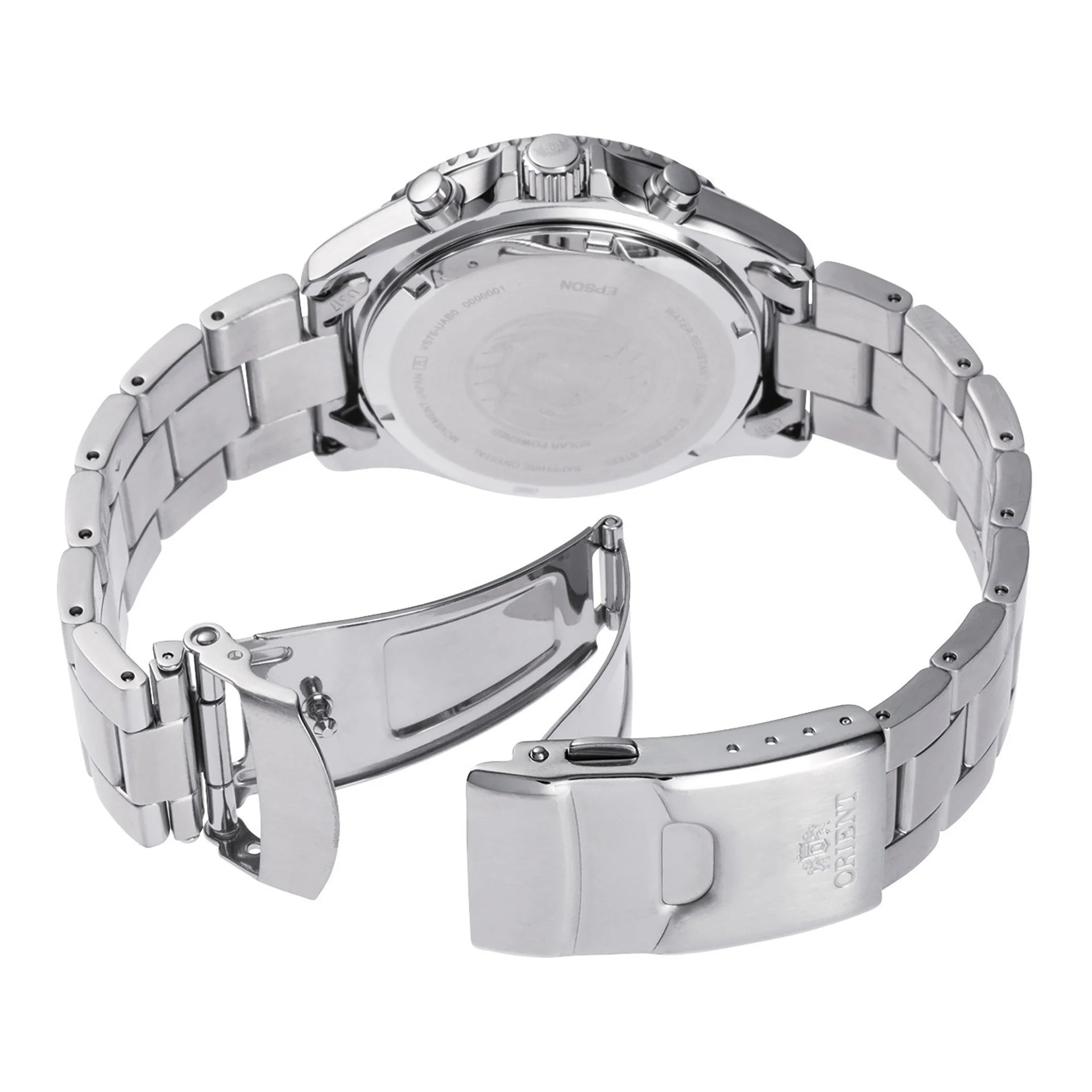 En el ámbito de los relojes, donde la precisión se encuentra con la elegancia, el ORIENT TX02 Mako Solar Chrono emerge como un faro de innovación y estilo. Fabricado en el corazón de la experiencia horológica, este reloj es un testimonio del espíritu aventurero de la familia ORIENT Sports. Su caja redonda, bañada en un sofisticado gris plateado, alberga una esfera turquesa vibrante que inyecta un toque de color en el mundo de los relojes deportivos. Este tono llamativo no solo capta la atención, sino que también encarna un estilo moderno que atrae a los audaces y atrevidos. El diámetro de la caja de 42 mm ofrece un equilibrio perfecto entre presencia y comodidad, convirtiéndolo en un compañero ideal para quienes buscan funcionalidad y estilo. Con una resistencia al agua de hasta 200 metros, este reloj de buceo está diseñado para quienes se atreven a explorar las profundidades, mientras que el cristal de zafiro y la corona atornillada garantizan durabilidad y claridad bajo presión. La correa de acero inoxidable, también en gris plateado, complementa la caja, proporcionando un diseño continuo y refinado que es a la vez resistente y elegante. El cierre desplegable con botón pulsador y seguro garantiza un ajuste seguro, permitiendo al usuario moverse con confianza. Impulsado por movimiento solar, el TX02 Mako Solar Chrono no solo es respetuoso con el medio ambiente, sino también fiable, con un calibre VS752 que promete precisión. El cronógrafo y la visualización de la hora en formato 24 horas añaden capas de funcionalidad, mientras que el calendario de fecha te mantiene sincronizado con el mundo. Este reloj es más que un dispositivo para medir el tiempo, es una declaración de estilo y un testimonio del espíritu aventurero de quienes lo llevan.