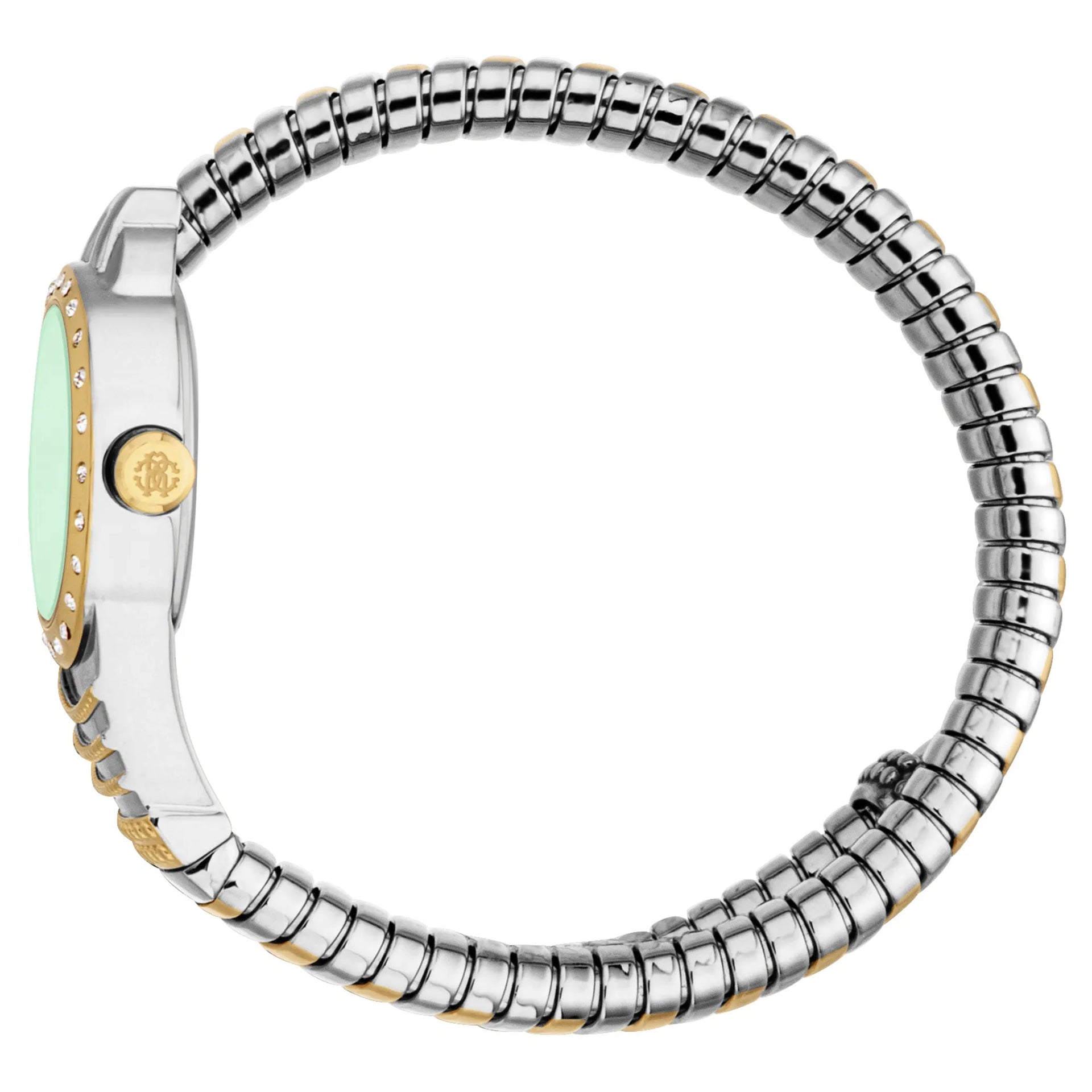 El reloj Lady de Roberto Cavalli cautiva con su caja y correa redondas de color gris plateado, que complementan perfectamente la esfera verde botella. Este reloj resistente al agua, adornado con un cristal mineral, encarna el compromiso de la marca con la moda y la elegancia, convirtiéndolo en un accesorio imprescindible.