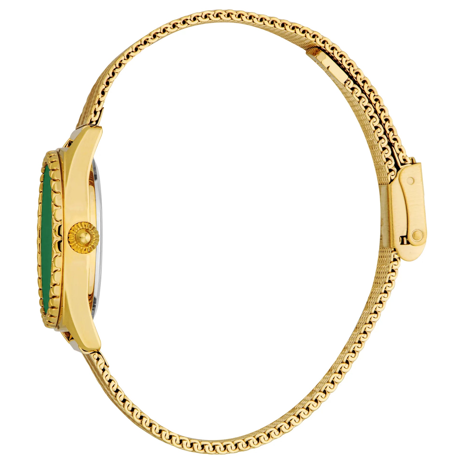 Dans le domaine de la mode, où l'élégance rencontre l'audace, émerge une montre qui capture l'essence de la sophistication et de l'audace. Conçue au cœur du style, cette Just Cavalli Watch de la prestigieuse collection Animalier est un témoignage du flair de la marque pour l'extraordinaire. Le boîtier rond, baigné d'une teinte luxueuse d'or jaune, dégage un sentiment d'opulence, complétant parfaitement le design raffiné qui définit cet accessoire exquis. Avec un diamètre de boîtier de 30 mm, elle repose gracieusement sur le poignet, une déclaration subtile mais frappante de pensée avant-gardiste en matière de mode. Le cadran vert bouteille, rappelant les forêts profondes et luxuriantes, ajoute une touche de mystère et de charme, attirant le regard par sa profondeur captivante. Enveloppé dans un cristal minéral, le cadran est protégé, garantissant clarté et durabilité. Le bracelet en acier inoxydable, également en or jaune, s'enroule autour du poignet avec une boucle coulissante réglable, offrant à la fois confort et sécurité. Cette montre n'est pas seulement un garde-temps, c'est un symbole de grâce et de force féminines, animée par un mouvement quartz précis et dotée d'un affichage classique à 3 aiguilles. Résistante à l'eau, elle est prête à vous accompagner dans les aventures de la vie, un rappel constant de l'esprit audacieux qui est en vous.