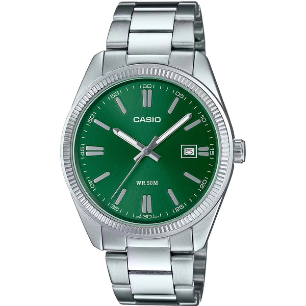 Dans le domaine de l'élégance intemporelle, où la précision rencontre le style, émerge un chef-d'œuvre de la Collection CASIO. Conçue avec un souci du détail, cette montre incarne l'essence de la sophistication classique. Son boîtier rond, baigné d'une teinte gris argenté élégante, mesure un diamètre raffiné de 38 mm, offrant un équilibre parfait entre présence et subtilité. Le verre minéral protège un cadran vert vibrant, un clin d'œil à une touche de couleur qui ajoute une note moderne à ses racines classiques. Ce cadran saisissant n'est pas seulement un régal pour les yeux, mais aussi un témoignage de fonctionnalité, présentant un affichage analogique alimenté par un mouvement quartz fiable. Le calendrier date ajoute une touche pratique, vous assurant de rester à jour dans votre emploi du temps avec aisance. Enveloppant le poignet avec grâce, le bracelet en acier inoxydable reflète l'élégance gris argenté du boîtier, sécurisé par une boucle déployante papillon avec un bouton-poussoir pour un port sans effort. Résistante à l'eau, cette montre est conçue pour vous accompagner dans les aventures de la vie, que vous naviguiez dans la jungle urbaine ou profitiez d'une journée sereine au bord de l'eau. La couronne à tirer et pousser offre une interaction fluide, améliorant le design raffiné de la montre. Cette montre CASIO est plus qu'un simple garde-temps, c'est une déclaration de style et de précision durables, conçue pour compléter la garde-robe de l'homme moderne avec son mélange harmonieux de tradition et de flair contemporain.