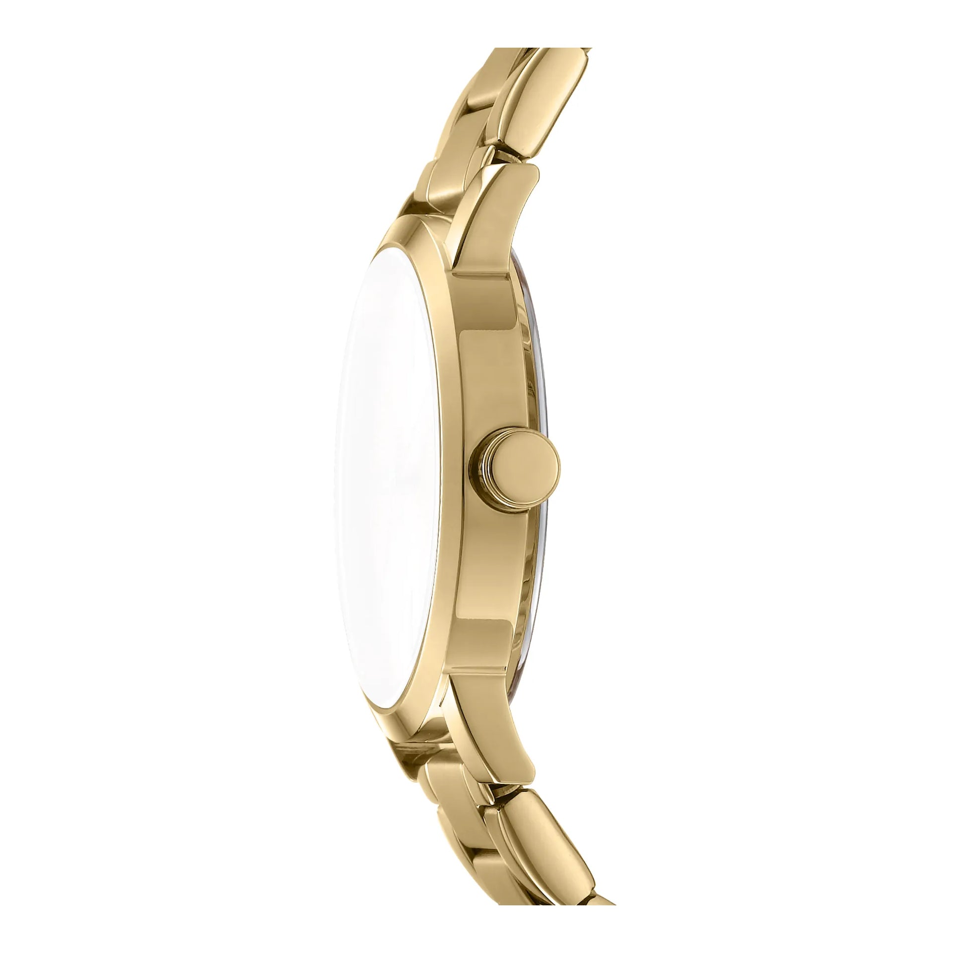 Nel cuore dell'eleganza urbana, dove la moda incontra la funzionalità, emerge un orologio che incarna lo spirito della sofisticazione moderna. Realizzato nel vibrante mondo di DKNY, l'orologio DK1L036 Soho Midi è una testimonianza dell'impegno del marchio per lo stile e la precisione. Con la sua cassa rotonda, immersa nel caldo bagliore dell'oro giallo, questo orologio cattura l'essenza di un fascino senza tempo. Il diametro di 34 mm raggiunge un perfetto equilibrio tra discrezione e impatto, rendendolo un compagno ideale per la donna attenta alla moda. Il quadrante champagne, che ricorda un tramonto dorato, aggiunge un tocco di lusso, mentre il cristallo minerale garantisce chiarezza e durata. Il cinturino in acciaio inossidabile, anch'esso in oro giallo, avvolge elegantemente il polso, fissato da una chiusura deployante a farfalla con pulsante per facilità e comfort. Resistente all'acqua fino a 50 metri, questo orologio è tanto versatile quanto bello, pronto ad accompagnarti dalle vivaci strade della città alle serene fughe sul mare. Il movimento al quarzo, alimentato dal calibro VJ32, promette precisione, mentre il calendario con data ti mantiene organizzata senza sforzo. Con un design raffinato che parla al cuore della scena della moda di New York, questo orologio DKNY è più di un accessorio, è una dichiarazione di stile e sofisticazione, un riflesso della vita dinamica della donna moderna.