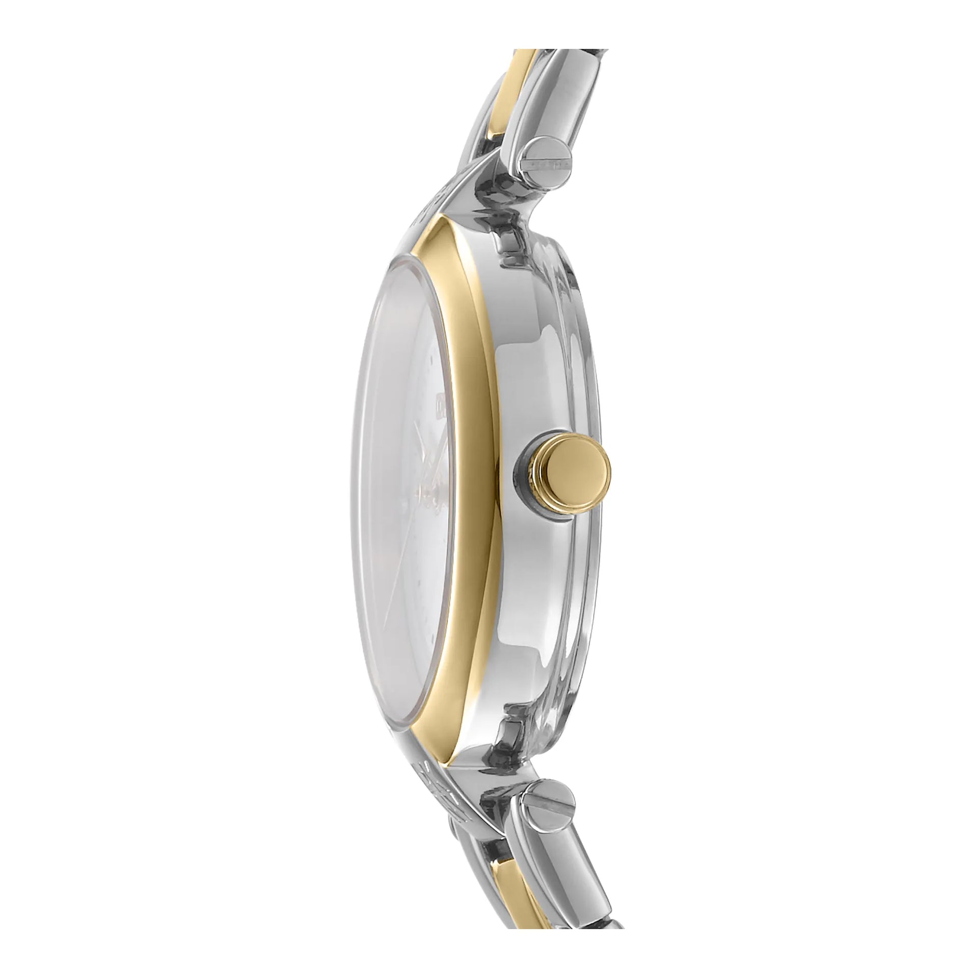 Nel cuore pulsante della città, dove la moda incontra la funzionalità, emerge un orologio che incarna l'essenza dell'eleganza urbana. Il DKNY Essential Mini, con la sua silhouette rotonda e slanciata, è una testimonianza di design raffinato e sofisticazione moderna. Realizzato in un argento grigio scintillante, la cassa e il cinturino si fondono armoniosamente in una sinfonia di acciaio inossidabile, emanando un fascino senza tempo che completa ogni ensemble. Il diametro della cassa di 28 mm è perfettamente proporzionato per il polso femminile, offrendo un'affermazione delicata ma audace. Sotto il cristallo minerale, il quadrante bianco antico funge da tela di bellezza sobria, dove tre lancette danzano con grazia, alimentate da un preciso movimento al quarzo. La corona a tirare e spingere aggiunge un tocco di praticità, garantendo facilità d'uso senza compromettere lo stile. Con una resistenza all'acqua fino a 50 metri, questo orologio è versatile quanto chic, pronto ad accompagnarti dalla sala riunioni a una serata in città. La fibbia deployante pieghevole assicura una vestibilità sicura, permettendoti di indossarlo con fiducia. Questo orologio DKNY non è solo un accessorio, è un riflesso dello spirito della donna moderna—elegante, dinamica e senza sforzo alla moda.