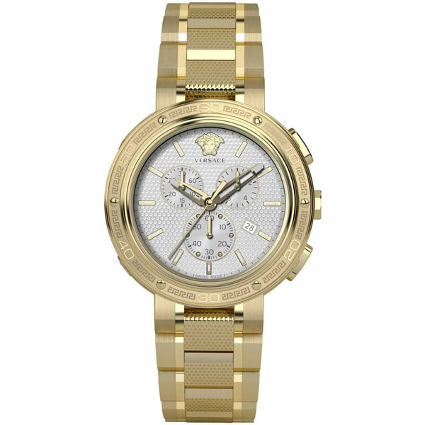 Nel mondo dell'alta moda, dove l'eleganza incontra la precisione, emerge un orologio che incarna l'essenza del lusso e della sofisticazione. Realizzato nel cuore della Svizzera, questo orologio Versace è una testimonianza dell'impegno del marchio per l'eccellenza e lo stile. La sua cassa rotonda, immersa nella tonalità opulenta dell'oro giallo, cattura l'attenzione con un diametro imponente di 46 mm, rendendolo una dichiarazione audace su qualsiasi polso. Il design raffinato è completato da un cinturino in acciaio inossidabile, anch'esso in oro giallo, che si integra perfettamente con una chiusura deployante a farfalla dotata di un pulsante per una facile indossabilità. Il quadrante bianco, una tela di purezza, è adornato con sotto-quadranti cronografici e un calendario della data, offrendo sia funzionalità che stile. Sotto il cristallo zaffiro, il movimento al quarzo garantisce precisione, mentre la corona a tirare e spingere aggiunge un tocco di fascino classico. Con una resistenza all'acqua fino a 50 metri, questo orologio non è solo un accessorio di moda ma un compagno affidabile per l'uomo moderno. La funzione cronografo ne aumenta l'appeal dinamico, rendendolo una perfetta combinazione di stile e prestazioni. Questo orologio Versace è più di un semplice misuratore del tempo, è un simbolo di gusto raffinato ed eleganza senza tempo, progettato per chi apprezza le cose più raffinate della vita.
