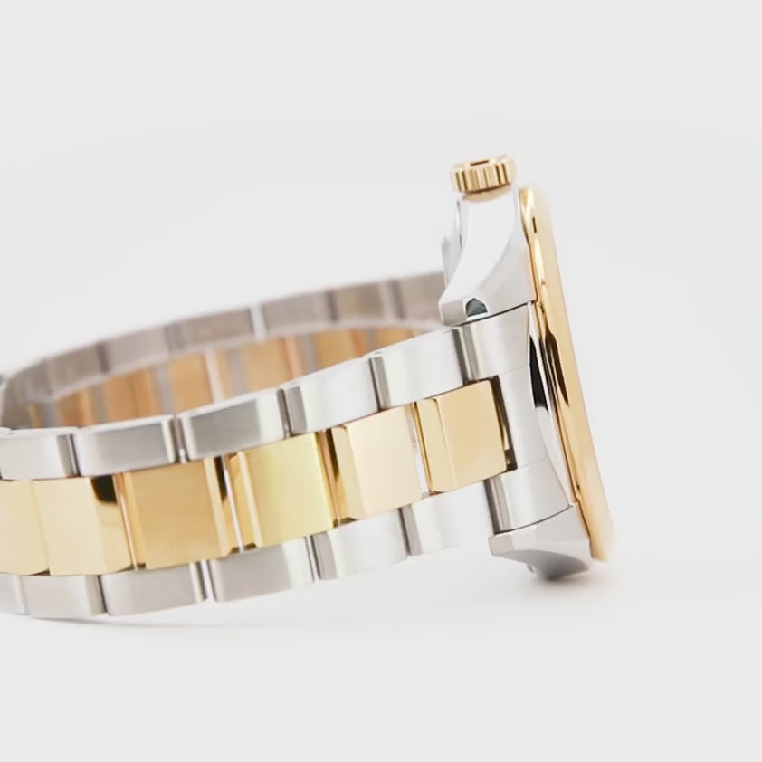 The 42mm round stainless steel case in silver-grey is beautifully accented by a striking yellow gold bezel, creating a sophisticated two-tone aesthetic that extends to the matching stainless steel bracelet with its secure folding deployant clasp. A scratch-resistant sapphire crystal protects the vibrant green dial, which features luminous hands for enhanced readability in any light, complemented by a convenient date display.