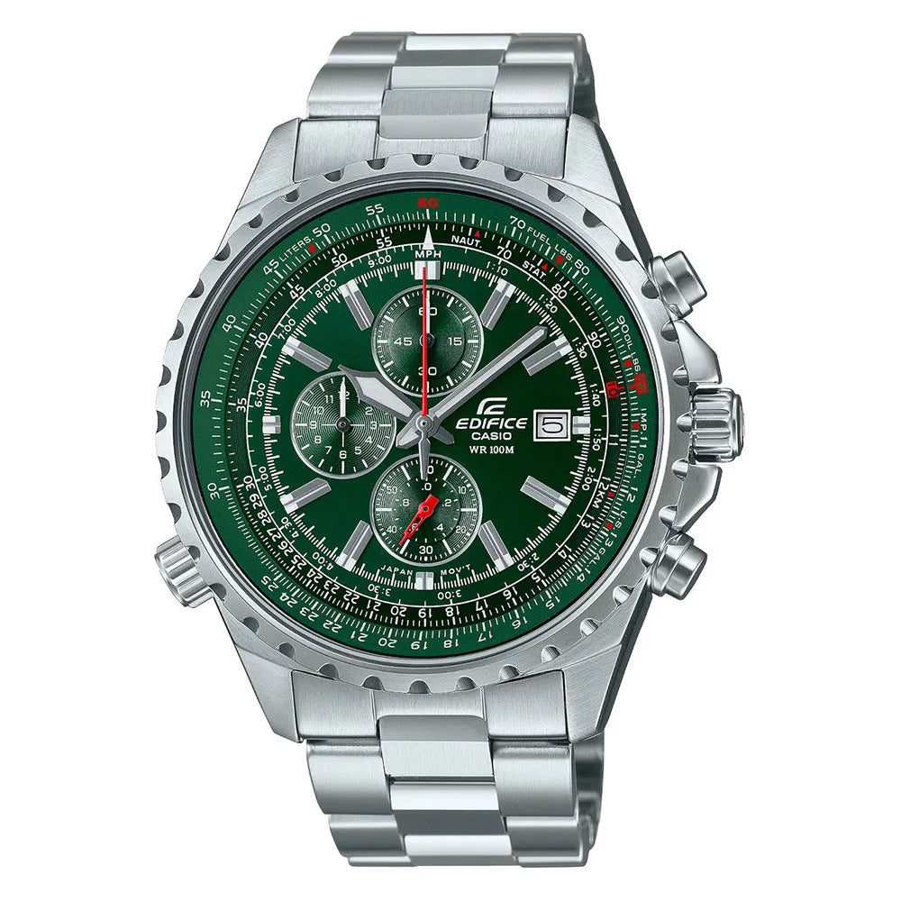 Con una presenza imponente, questo orologio rotondo grigio argento presenta un quadrante verde e un cinturino in acciaio inossidabile fissato da una fibbia déployante a farfalla. La resistenza all'acqua fino a 100 metri e un vetro minerale riflettono una fiducia senza tempo.
