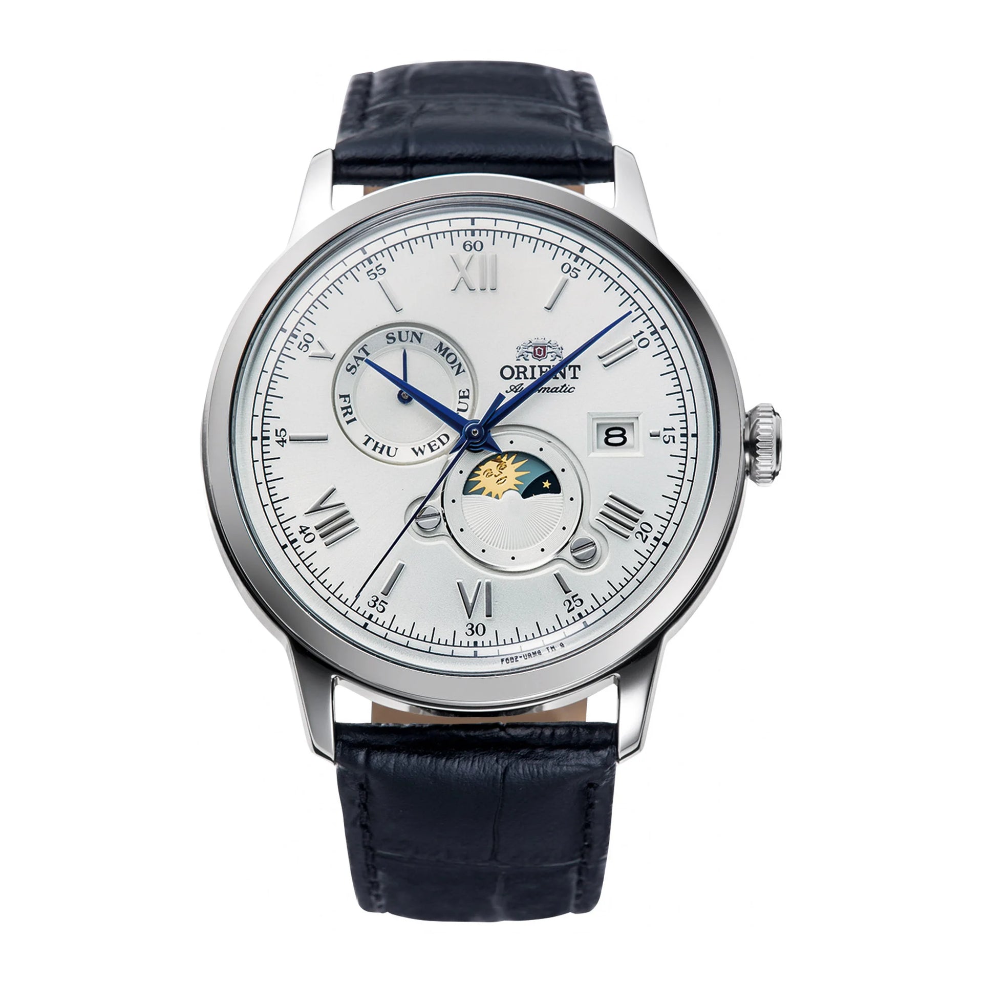 Nel regno dell'eleganza orologiera, l'ORIENT AK08 Bambino Sun & Moon emerge come un capolavoro senza tempo, una testimonianza dell'arte della orologeria. Realizzato nel cuore della precisione, questo orologio ORIENT Classic incarna la quintessenza della sofisticazione e dello stile. La sua cassa rotonda, immersa in un lucente grigio argento, misura un elegante diametro di 41mm, offrendo un design raffinato che parla all'uomo esigente. Il vetro minerale rivela un quadrante bianco immacolato, dove la danza del tempo è orchestrata da tre eleganti lancette, alimentate dalla potenza meccanica del calibro F6B24. Con 22 rubini che garantiscono un funzionamento fluido, questo orologio promette una precisione quotidiana che sussurra di una lavorazione meticolosa. Il cinturino in pelle nera, fissato con una fibbia ad ardiglione, avvolge il polso con un tocco di lusso classico, mentre il fondello trasparente offre uno sguardo nel complesso balletto di ingranaggi e molle. Resistente all'acqua e dotato di corona a tirare e spingere, questo orologio è tanto pratico quanto bello. Il calendario giorno e data aggiunge un livello di funzionalità, rendendolo un compagno perfetto per l'uomo moderno. Sia a carica manuale che automatica, l'ORIENT AK08 Bambino Sun & Moon è una celebrazione del tempo stesso, un orologio che non solo segna l'ora, ma racconta una storia di eleganza e stile duraturo.