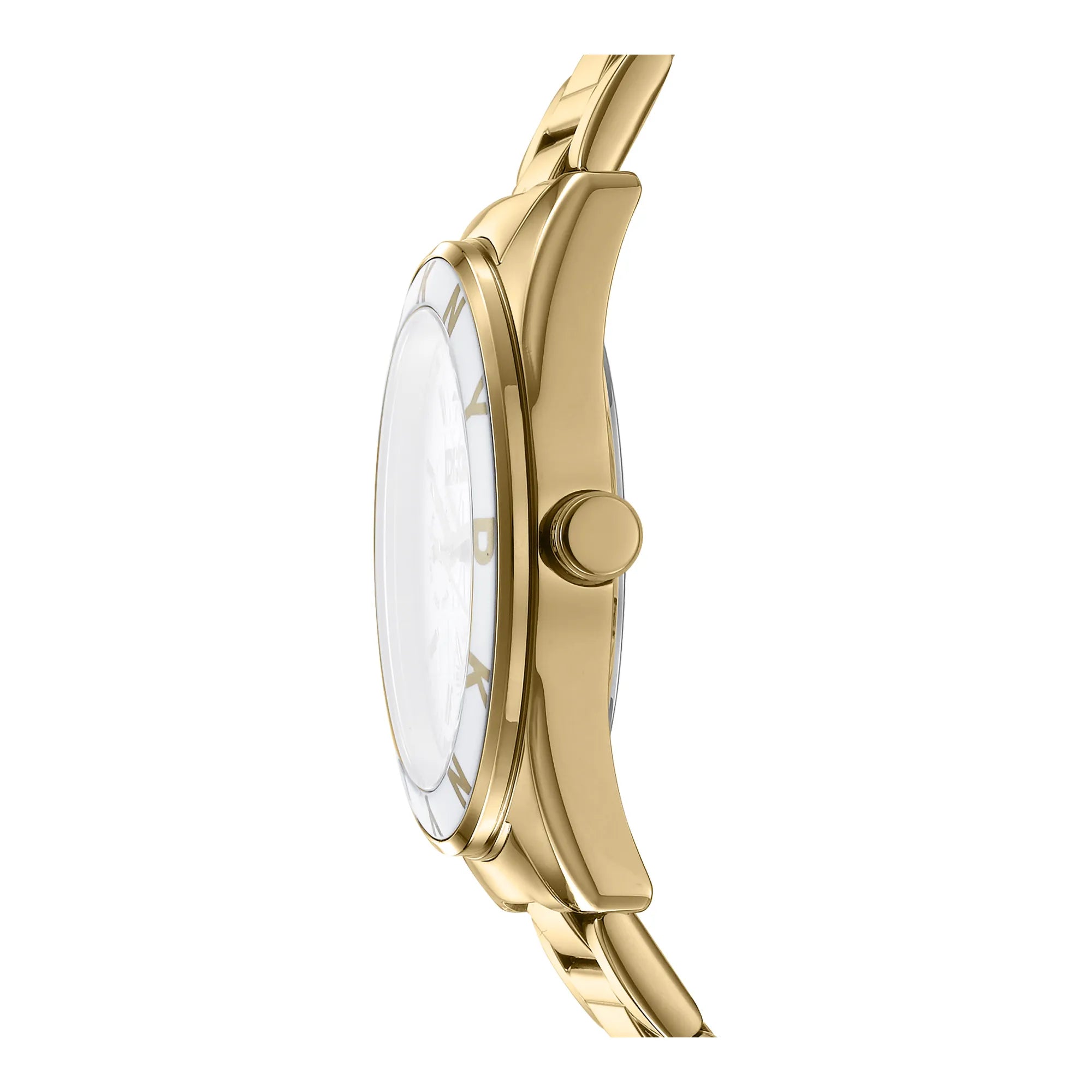 In the heart of urban elegance, the DKNY Chambers Multi Sport watch emerges as a beacon of contemporary style and sophistication. Crafted in a round silhouette, its yellow gold case gleams with a luxurious allure, perfectly complementing the stainless steel band that wraps around the wrist with a seamless grace. The butterfly deployant clasp with a push-button ensures a secure fit, marrying functionality with fashion. At the center of this masterpiece lies a bottle green dial, a nod to timeless elegance, where the multi-function display dances with precision, powered by a reliable quartz movement. The day and date calendar type, driven by the 6P29 caliber, offers practicality without compromising on style. With a water resistance of up to 50 meters, this watch is as versatile as it is beautiful, ready to accompany you from the bustling city streets to serene waterside retreats. The mineral crystal adds a layer of durability, protecting the intricate details beneath. This DKNY watch is not just an accessory, it's a statement of refined design and modern femininity, capturing the essence of a woman who is both bold and graceful.