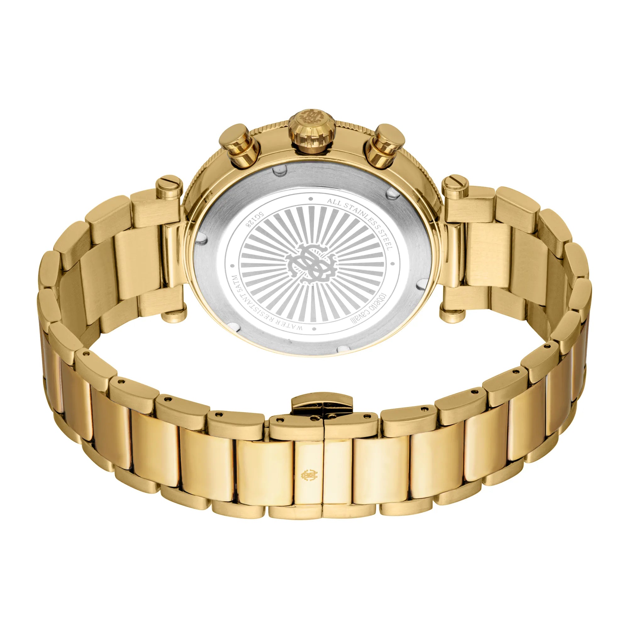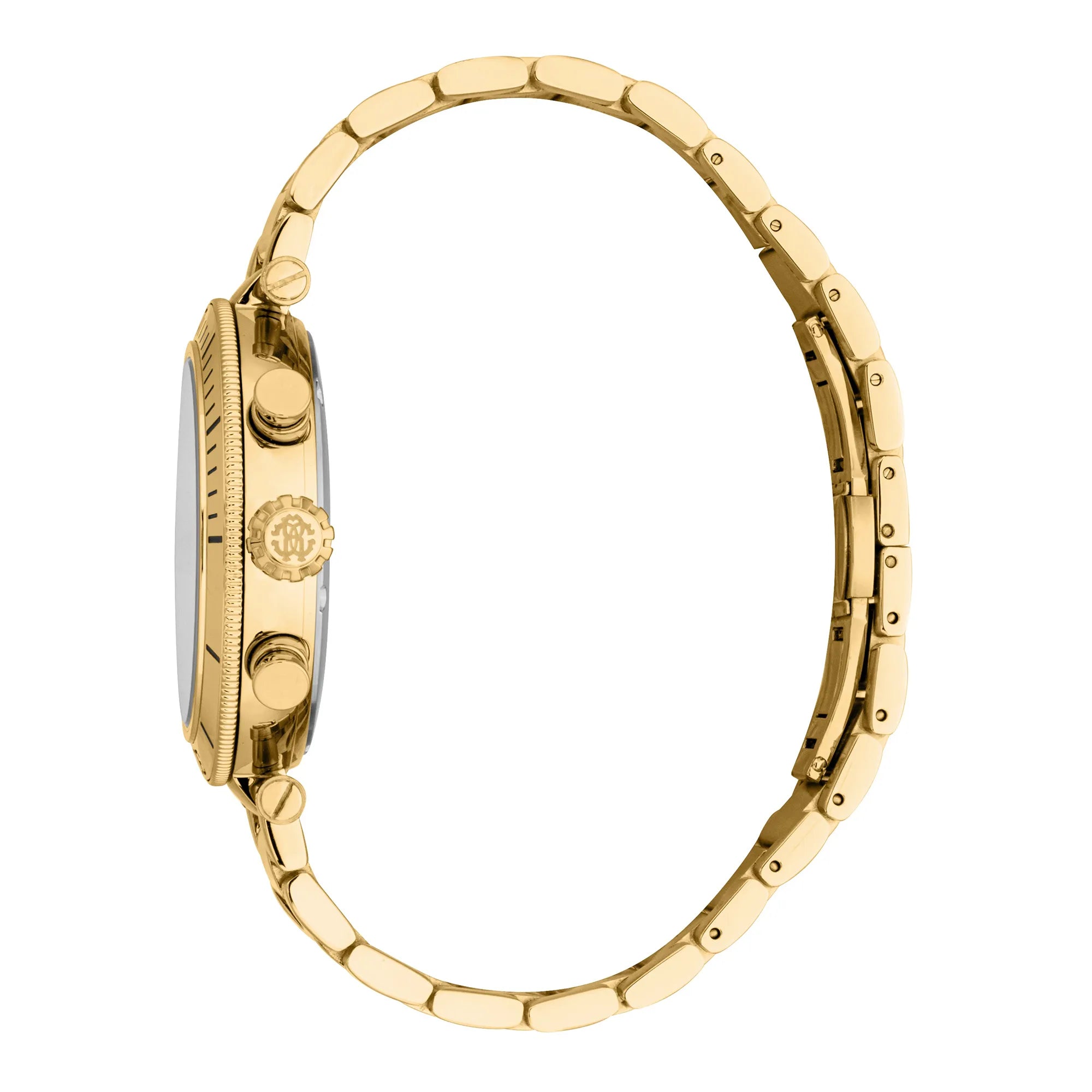 In the world of horology, where elegance meets precision, emerges a timepiece that embodies the essence of sophistication and style. Crafted in the heart of Swiss watchmaking, this Roberto Cavalli Gent watch is a testament to the brand's commitment to luxury and innovation. Its round case, bathed in the opulence of yellow gold, commands attention with a diameter of 43mm, making a bold statement on the wrist of the discerning gentleman. The mineral crystal shields a striking black dial, where the art of timekeeping is elevated to a new level with a chronograph display and a date calendar, powered by the reliable JS25 quartz movement. The watch's refined design is further accentuated by a stainless steel band, also in yellow gold, seamlessly integrated with a butterfly deployant clasp with a push-button for secure and effortless wear. Water-resistant up to 100 meters, this timepiece is as versatile as it is elegant, ready to accompany its wearer from the boardroom to the depths of the ocean. The pull & push crown adds a touch of classic charm, while the 24-hour time feature ensures that every moment is captured with precision. This Roberto Cavalli watch is not just an accessory, it is a statement of fashion and functionality, a reflection of the modern man's desire for excellence and style.
