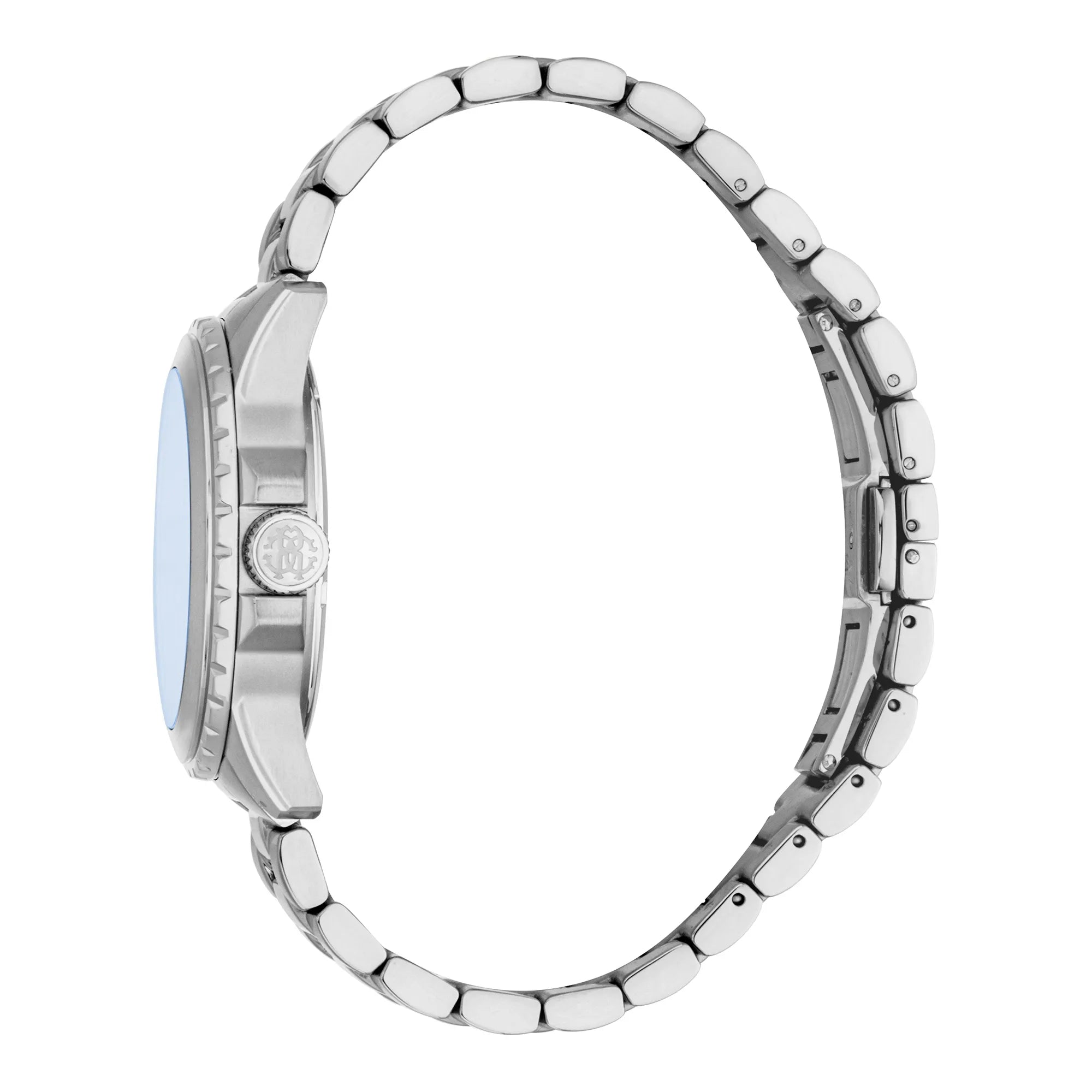 Het Roberto Cavalli Gent horloge is een meesterwerk van ontwerp, met zijn zilvergrijze ronde kast en roestvrijstalen band. Een nachtblauwe wijzerplaat, omhuld door mineraalglas, biedt een opvallend contrast en maakt het een betoverend sieraad voor elke gelegenheid.