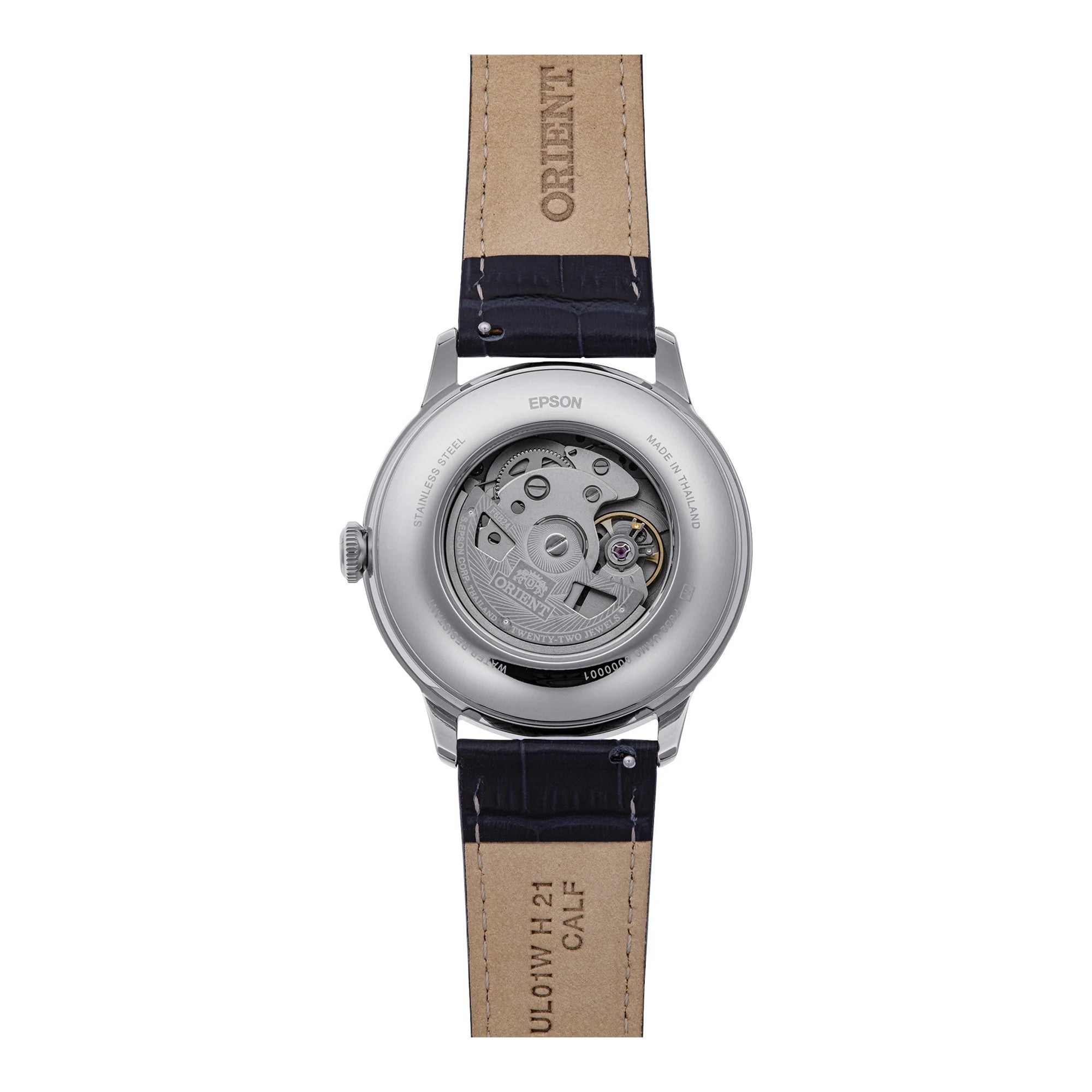 In the realm of timeless elegance, the ORIENT AK08 Bambino Sun & Moon emerges as a beacon of classic sophistication. Crafted in the heart of horological tradition, this watch embodies the perfect blend of artistry and precision. Its round case, bathed in a silver-grey hue, exudes a refined design that captures the essence of understated luxury. With a diameter of 41mm, it sits gracefully on the wrist, a testament to its impeccable craftsmanship. The night blue leather band, secured with a tang buckle, complements the dial's deep, celestial shade, creating a harmonious symphony of color and texture. Beneath the mineral crystal, the dial reveals a captivating display of day and date, orchestrated by the mechanical movement of the F6B24 caliber. With 22 jewels and a daily accuracy of +25/-15, this timepiece is a marvel of engineering, offering both hand-wound and automatic capabilities. The transparent back invites you to witness the intricate dance of its inner workings, a mesmerizing spectacle for the discerning eye. Water-resistant and designed for the modern gentleman, this ORIENT Classic watch is more than a mere accessory, it is a statement of enduring style and sophistication, a companion for those who appreciate the finer things in life.