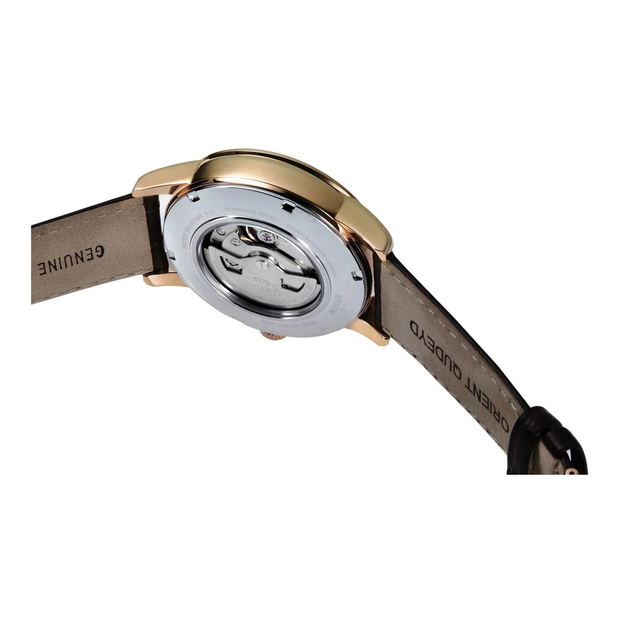 In the realm of horology, where elegance meets precision, the ORIENT Classic AK00 Sun & Moon watch stands as a testament to timeless sophistication. Crafted with meticulous attention to detail, this exquisite timepiece captures the essence of classic style with a modern twist. The round case, bathed in a luxurious rose gold hue, exudes an air of refined opulence, perfectly complementing the warm, champagne-colored dial. This harmonious blend of colors is further enhanced by the rich chocolate brown leather band, which wraps around the wrist with a sense of understated elegance. The folding deployant clasp with a push-button ensures a secure and comfortable fit, making it a perfect companion for any occasion. Beneath its sapphire crystal lies a world of mechanical marvels, powered by the F6B24 caliber with 22 jewels, offering both hand-wound and automatic movement options. The transparent back reveals the intricate dance of gears and springs, a mesmerizing spectacle for the discerning eye. With a water resistance of up to 50 meters, this watch is as practical as it is beautiful. The day and date calendar, displayed with precision, adds a touch of functionality to its classic design. The ORIENT Classic AK00 Sun & Moon watch is not just a timepiece, it is a statement of sophistication, a celebration of craftsmanship, and a tribute to the enduring allure of classic elegance.