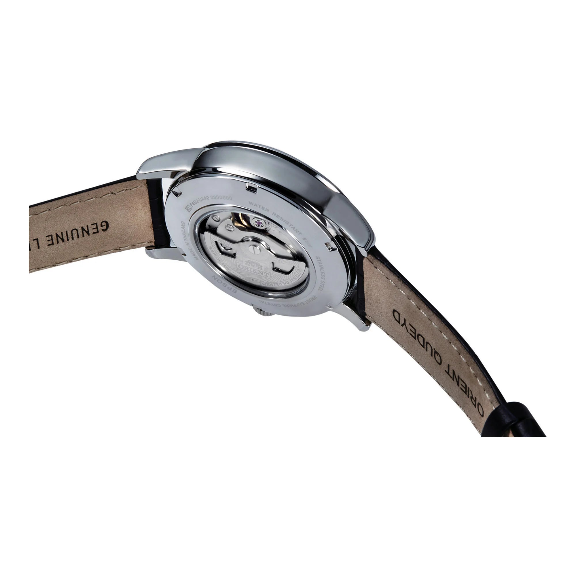 In the realm of horology, where time is both a science and an art, the ORIENT AK00 Sun & Moon emerges as a beacon of classic elegance and mechanical mastery. Crafted with precision, this timepiece is a testament to the timeless allure of traditional watchmaking. Its round case, bathed in a sophisticated silver grey, frames a captivating black dial that serves as the canvas for its intricate dance of time. The sapphire crystal, known for its clarity and resilience, protects the dial, while the transparent back offers a glimpse into the heart of the watch, revealing the intricate workings of its mechanical movement. The leather band, in a deep black hue, complements the case, offering a touch of refined sophistication, and is secured with a folding deployant clasp with a push-button for ease and comfort. The watch's mechanical movement, powered by the F6B24 caliber with 22 jewels, ensures precision with a daily accuracy of +25/-15. It boasts both hand-wound and automatic capabilities, making it a versatile companion for the discerning gentleman. The day and date calendar type adds functionality to its classic style, while the 50-meter water resistance ensures it withstands the elements. This ORIENT Classic watch is not just a timekeeper, it is a statement of elegance and a tribute to the enduring art of watchmaking.