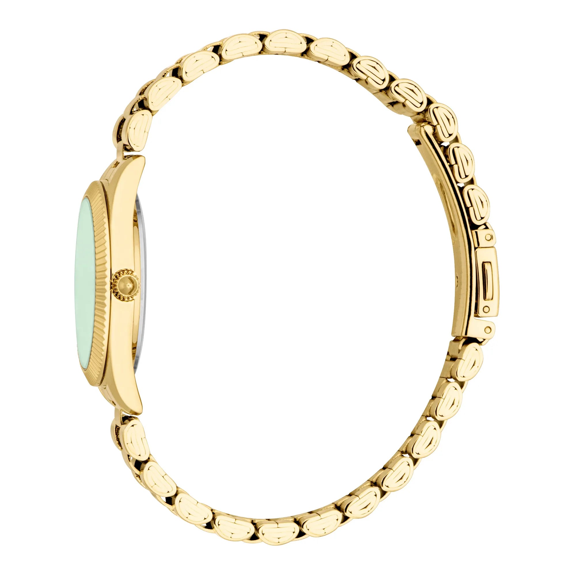 Święto koloru i luksusu, ten okrągły zegarek z żółtego złota ma butelkowozieloną tarczę i dopasowaną bransoletę ze stali nierdzewnej. Koperta o średnicy 30 mm i składane zapięcie motylkowe tworzą harmonijną sylwetkę, czyniąc go promiennym elementem wyróżniającym dla wymagającej kobiety.